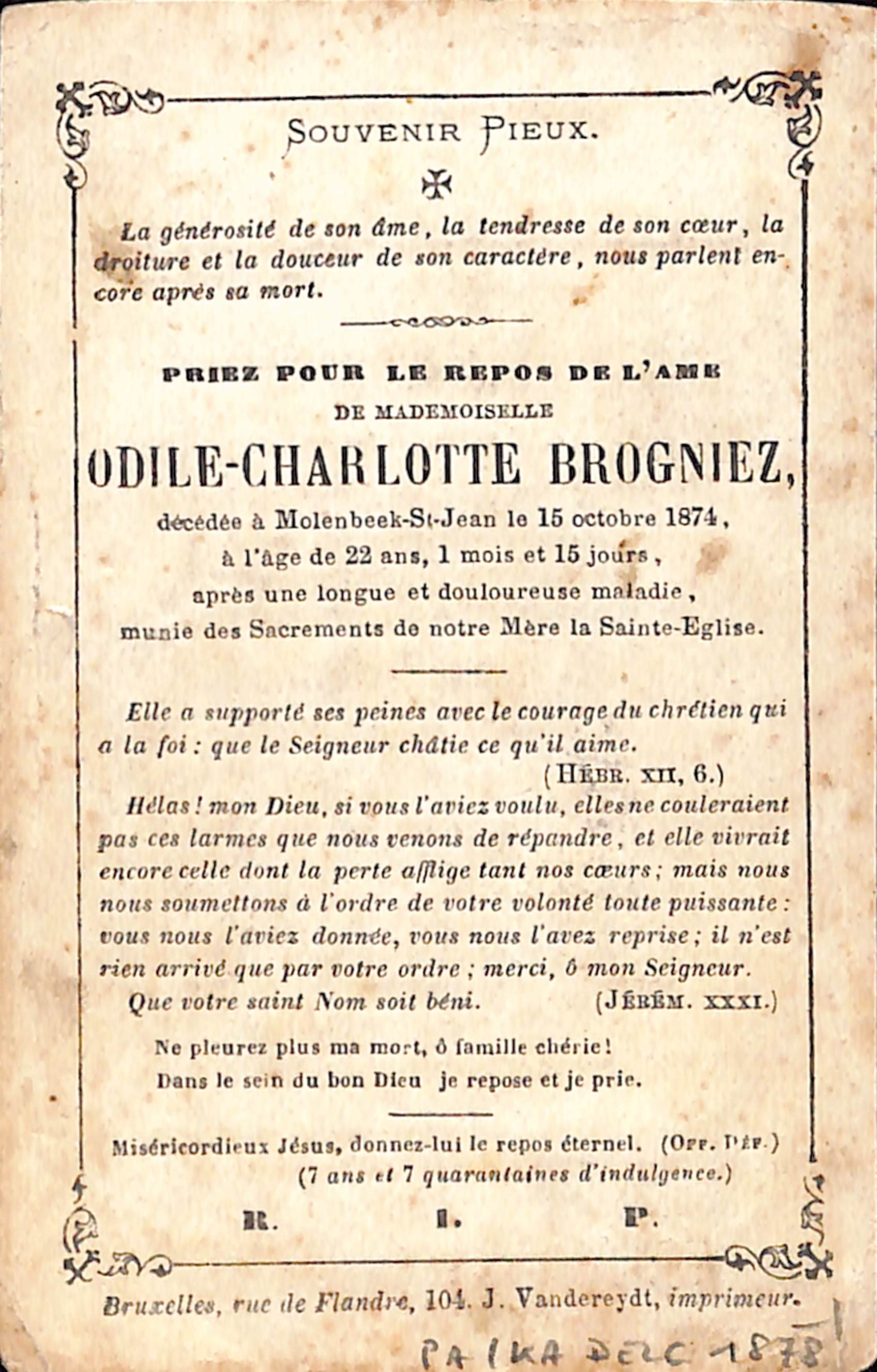 Souvenir pieux Odile-Charlotte Brogniez (décédée à Molenbeek-Saint-Jean, 1874), éd. L. Turgis (Paris), impr. J. Vandereydt (Bruxelles), 1874.