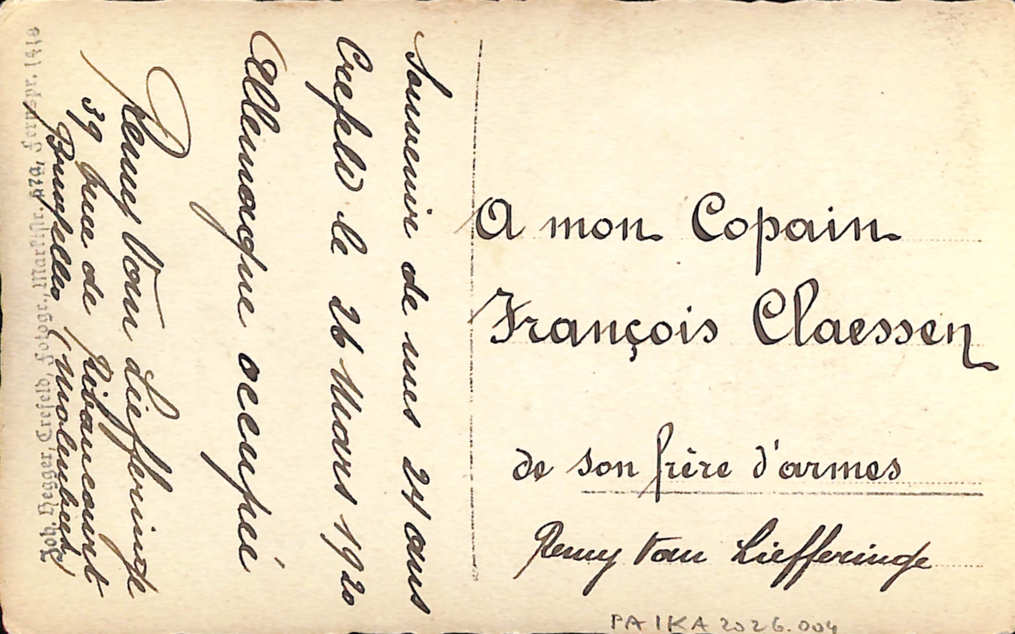 Carte photo Remy Van Liefferinge, soldat belge stationné en Allemagne occupée, photogr. Joh. Hegger (Krefeld), 1920.