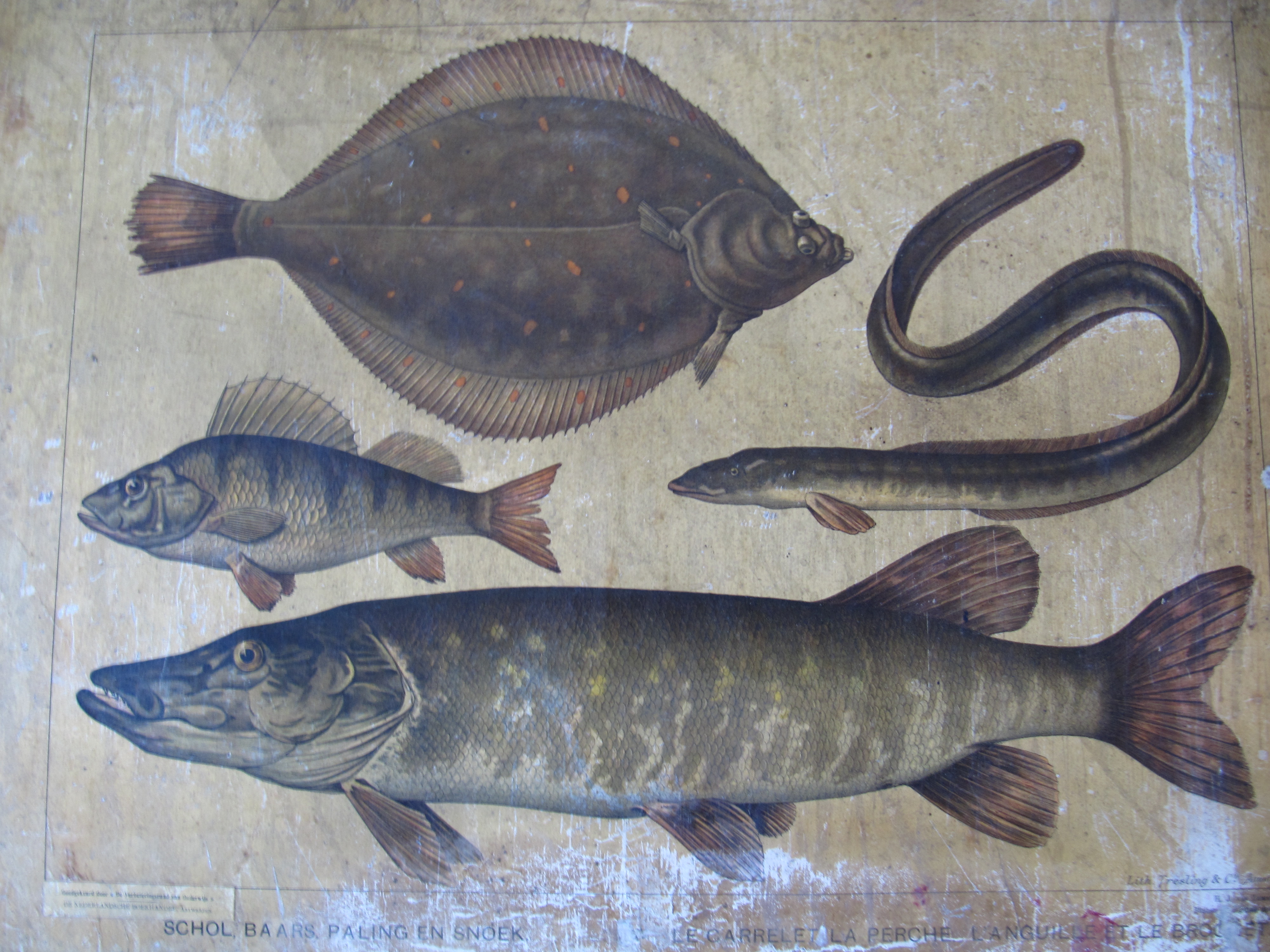 Panneau didactique Poissons : Carrelet, perche, anguille et brochet, lithogr. Tresling & C°(Amsterdam), éd. H.J. van Lummel, s.d.