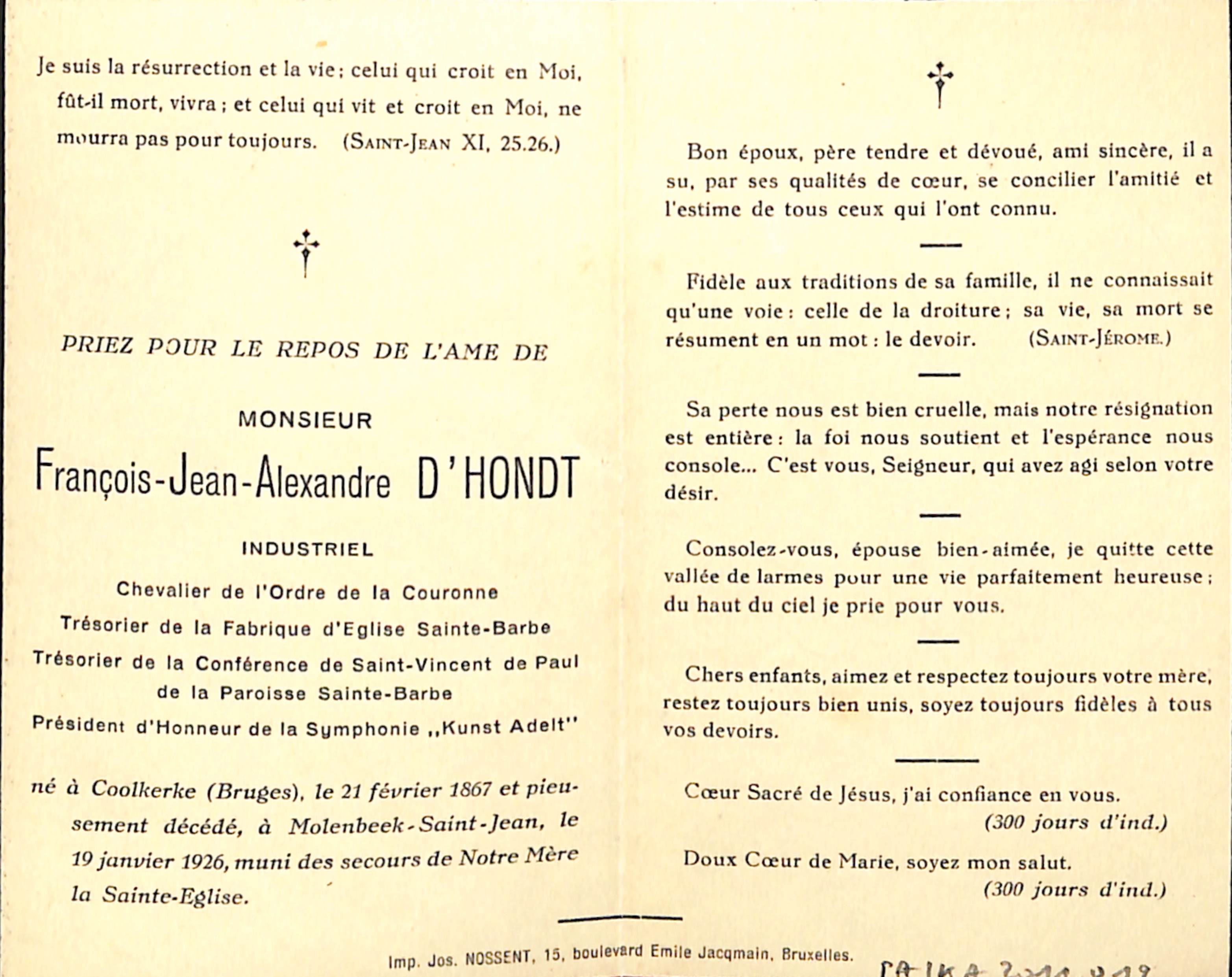 Souvenir pieux François-Jean-Alexandre D'Hondt, industriel (Koolkerke, 1867 - Molenbeek-Saint-Jean, 1926), impr. Jos. Nossent (Bruxelles), 1926.