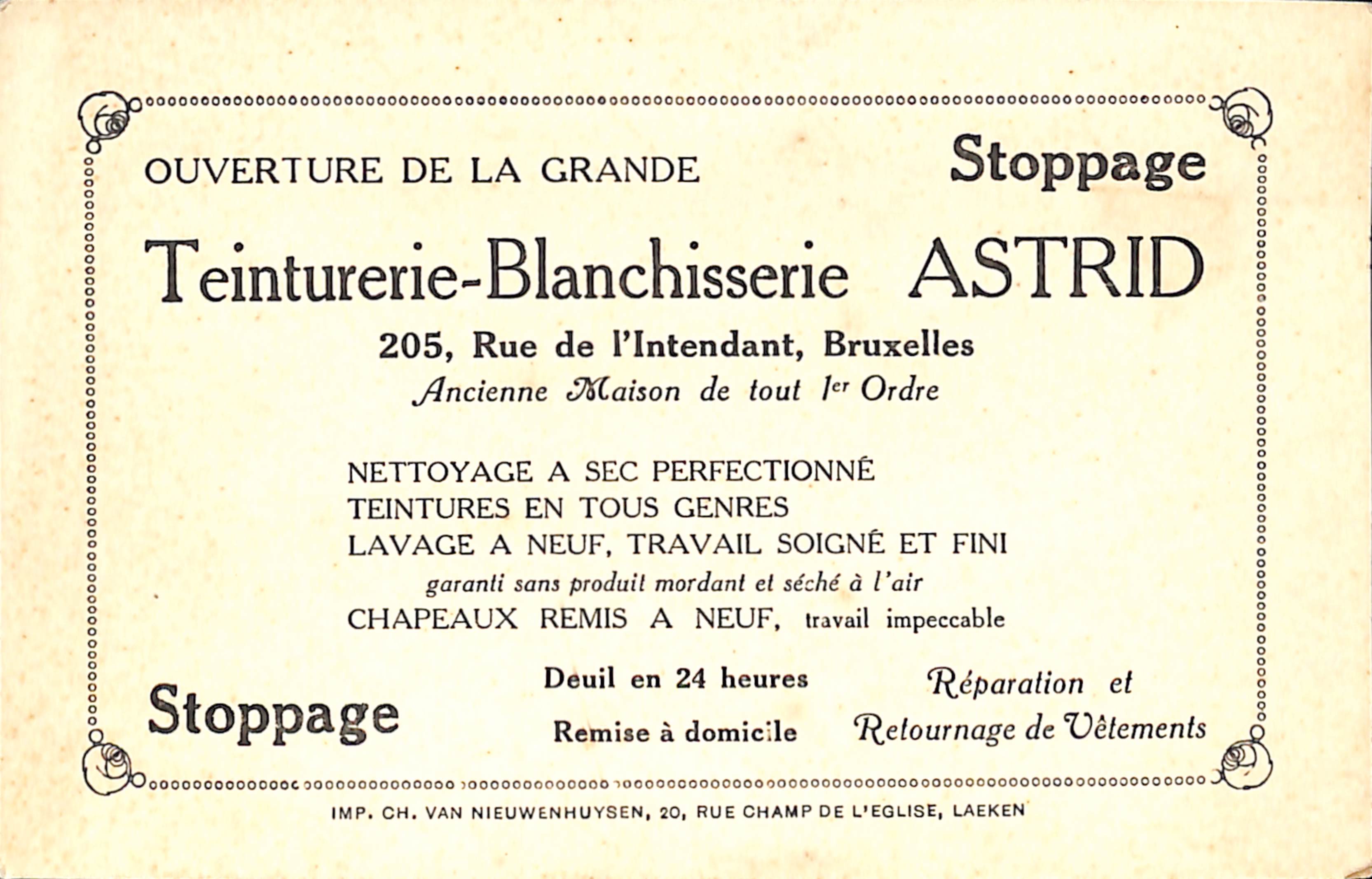 Carton publicitaire Teinturerie-blanchisserie Astrid, Rue de l'Intendant, 205 (Molenbeek-Saint-Jean), impr. Ch. Van Nieuwenhuysen (Laeken), s.d.