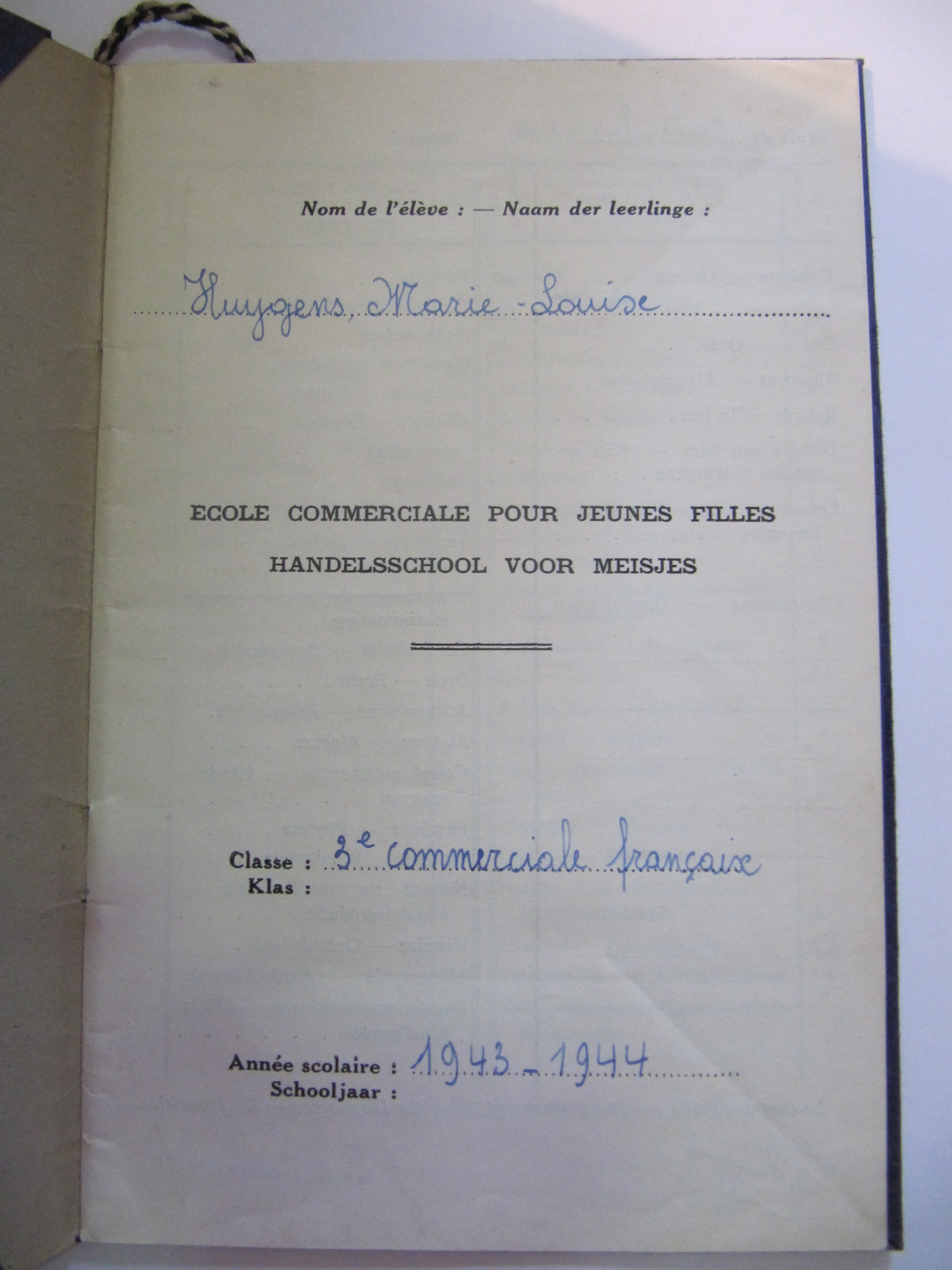 Carnet scholaire de l'élève Marie Louise Huygens, Ecole commerciale pour jeunes filles (Molenbeek-Sant-Jean), 1943-1944.