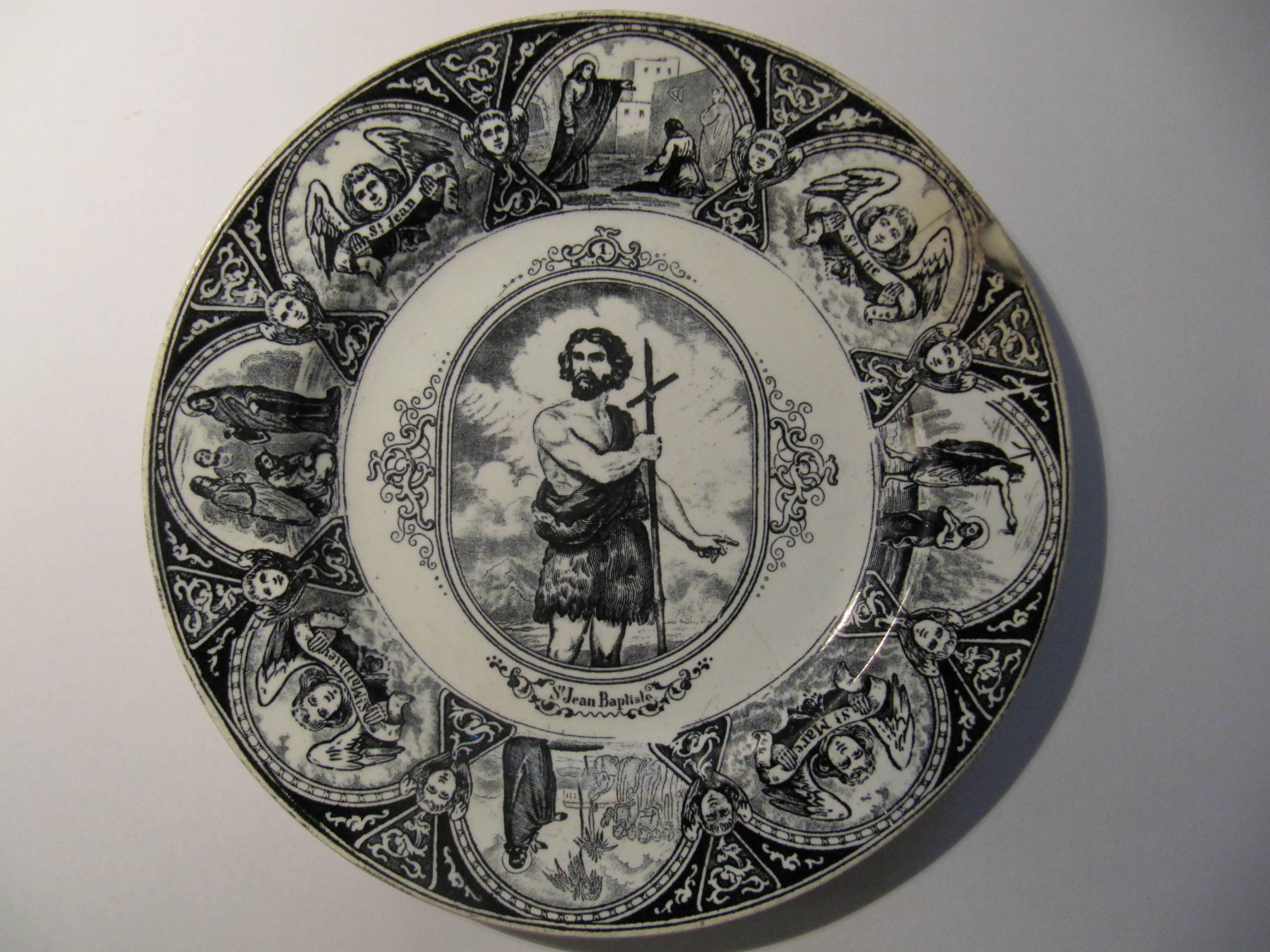 Assiette évoquant Saint Jean-Baptiste, la vie du Christ et les quatre Evangélistes, porcelaine peinte, s.d.