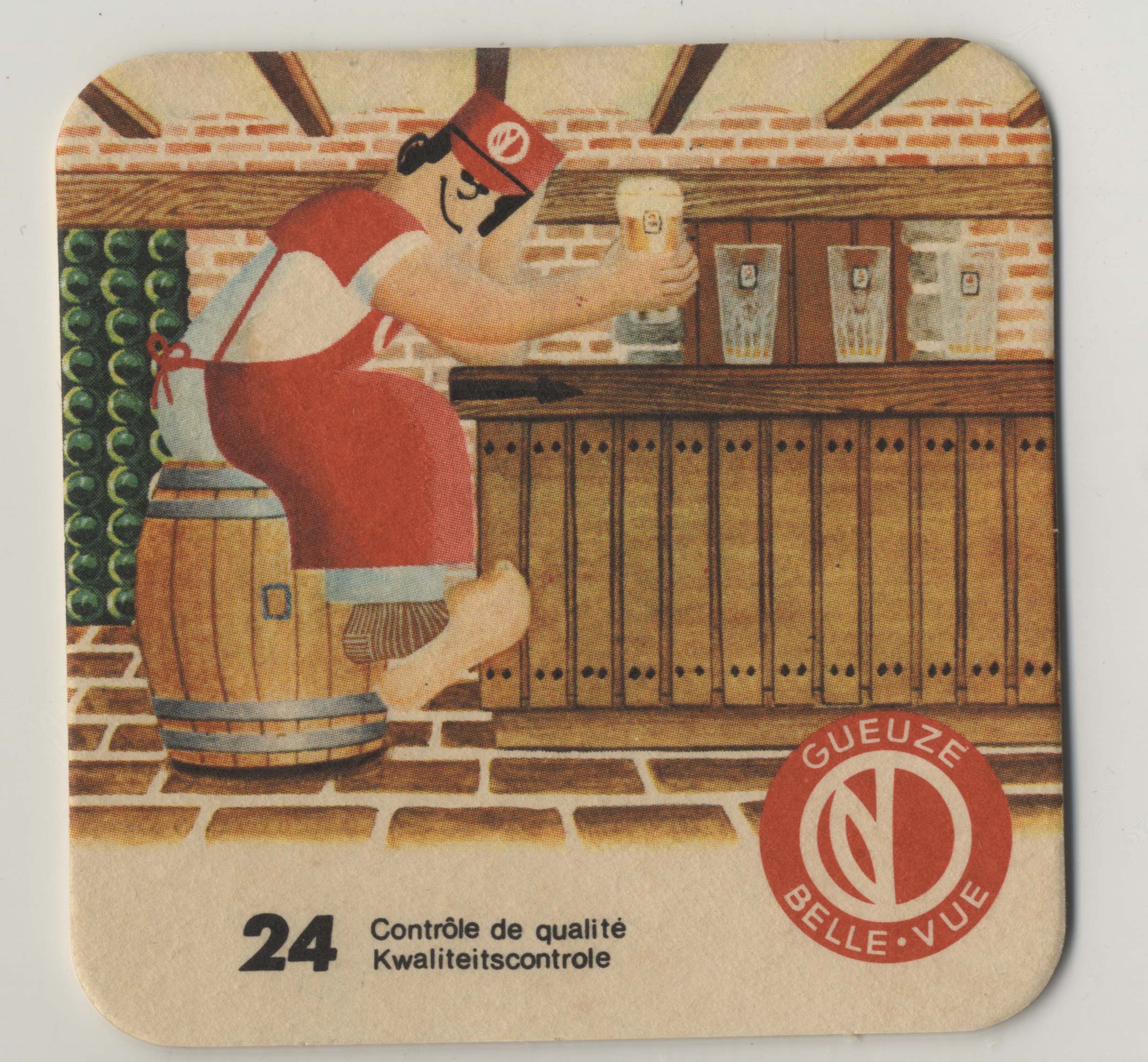 Sous-bock publicitaire Brasserie Belle-vue illustrant la fabrication de gueuze, 24 : Le contrôle de qualité, s.d.