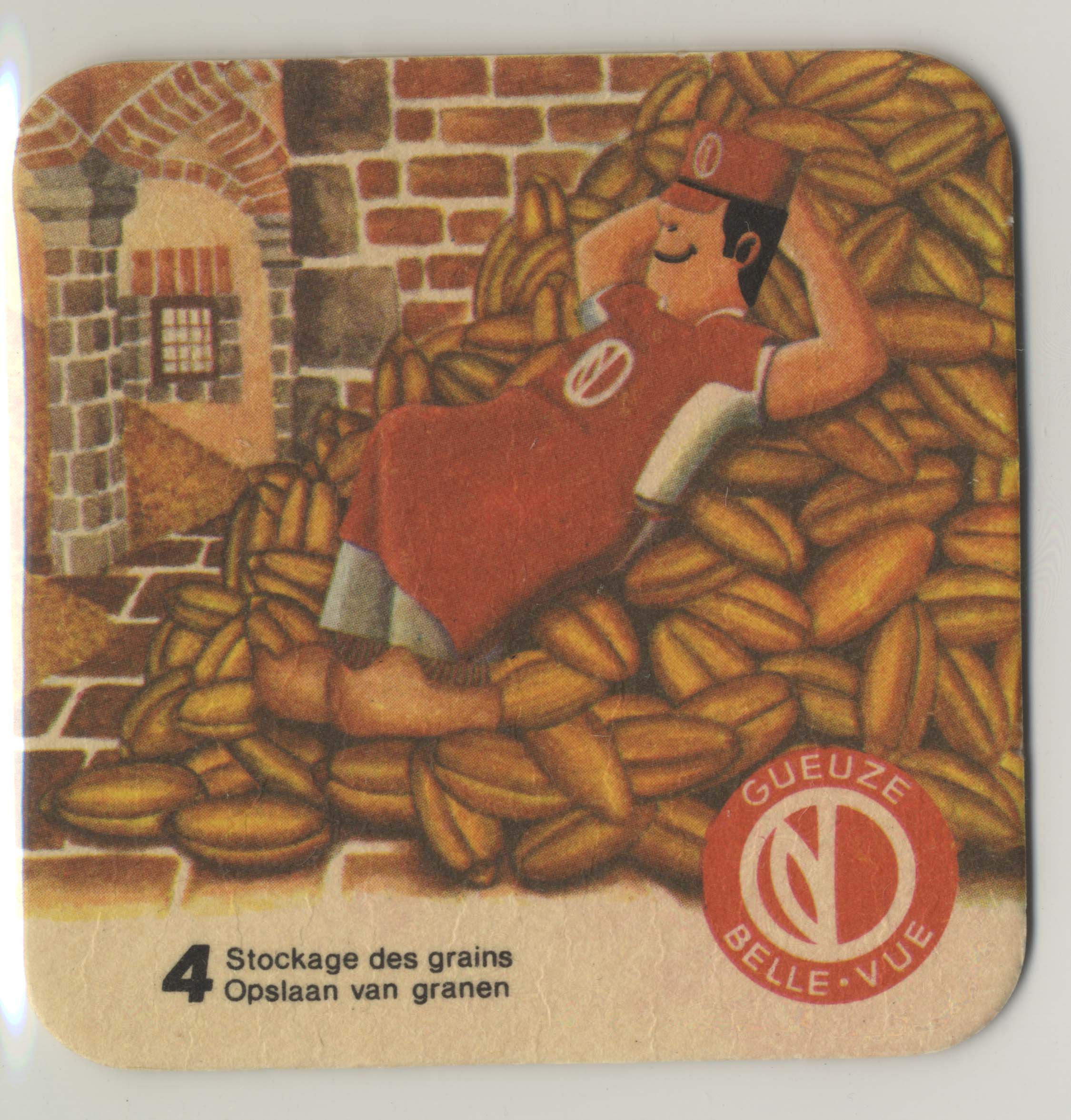 Sous-bock publicitaire Brasserie Belle-vue illustrant la fabrication de gueuze, 4 : Stockage des grains, s.d.