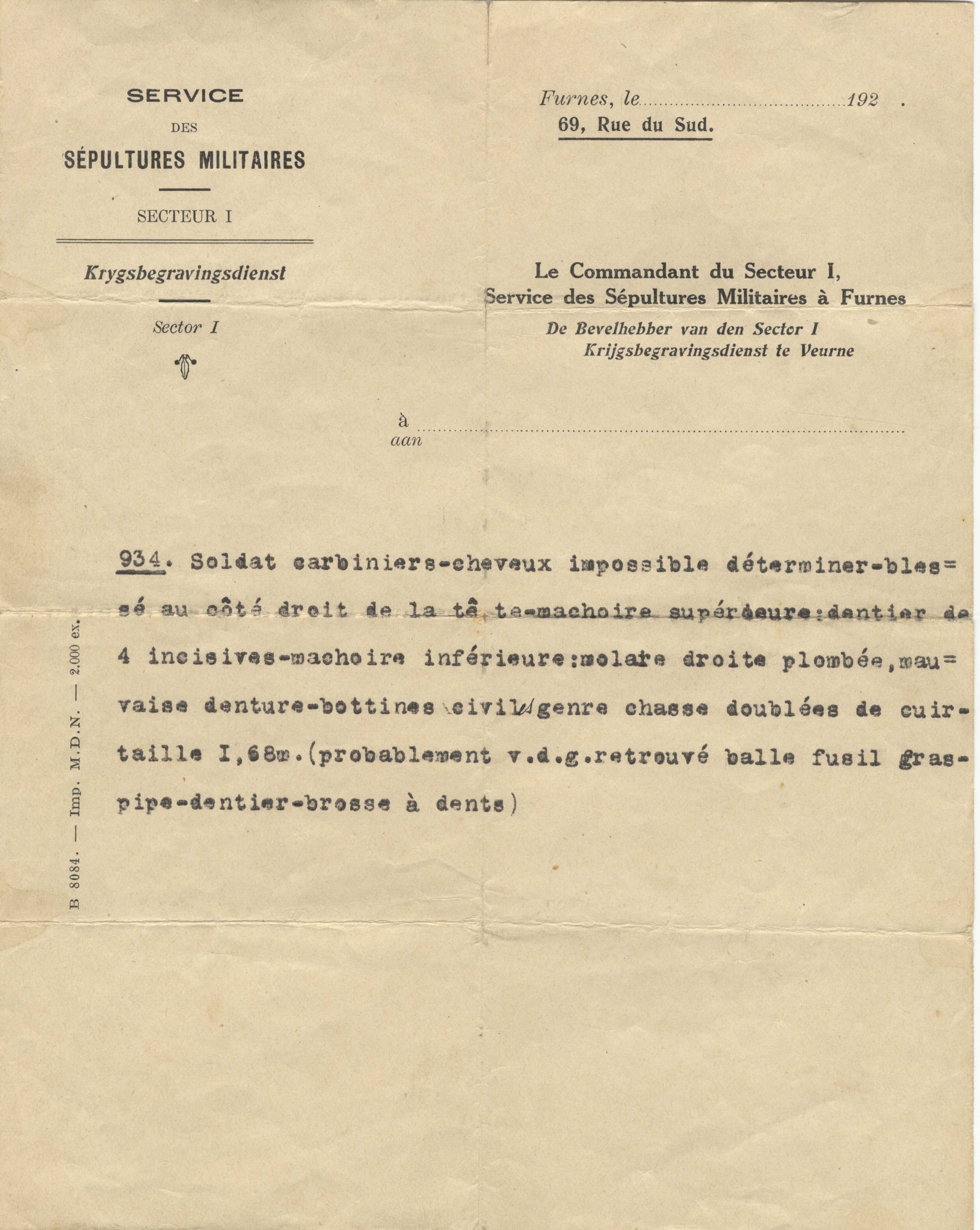 Service des sépultures militaires, Document d'identification du corps du soldat belge Jean Schols tombé en 1914, s.d. [années 1920].