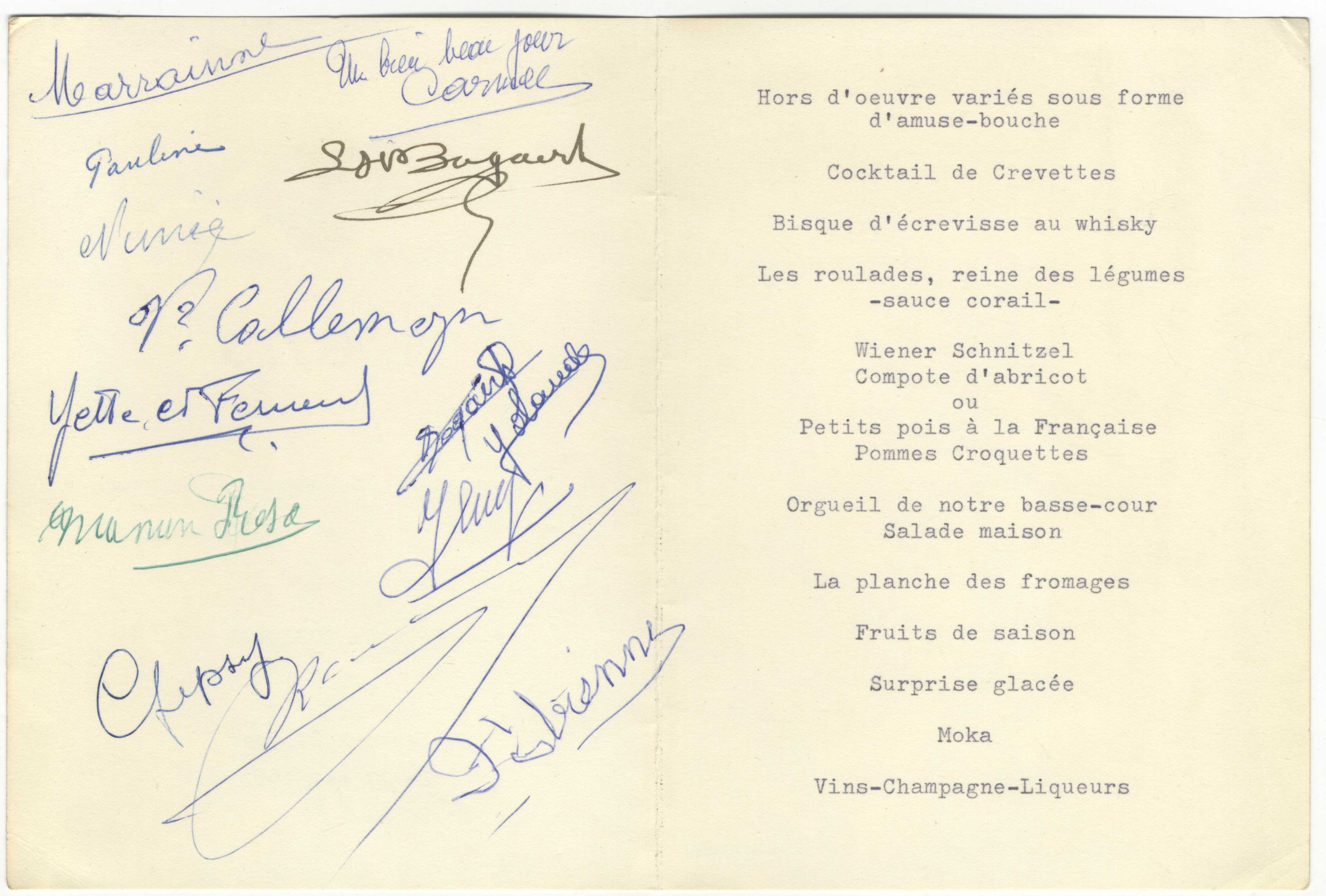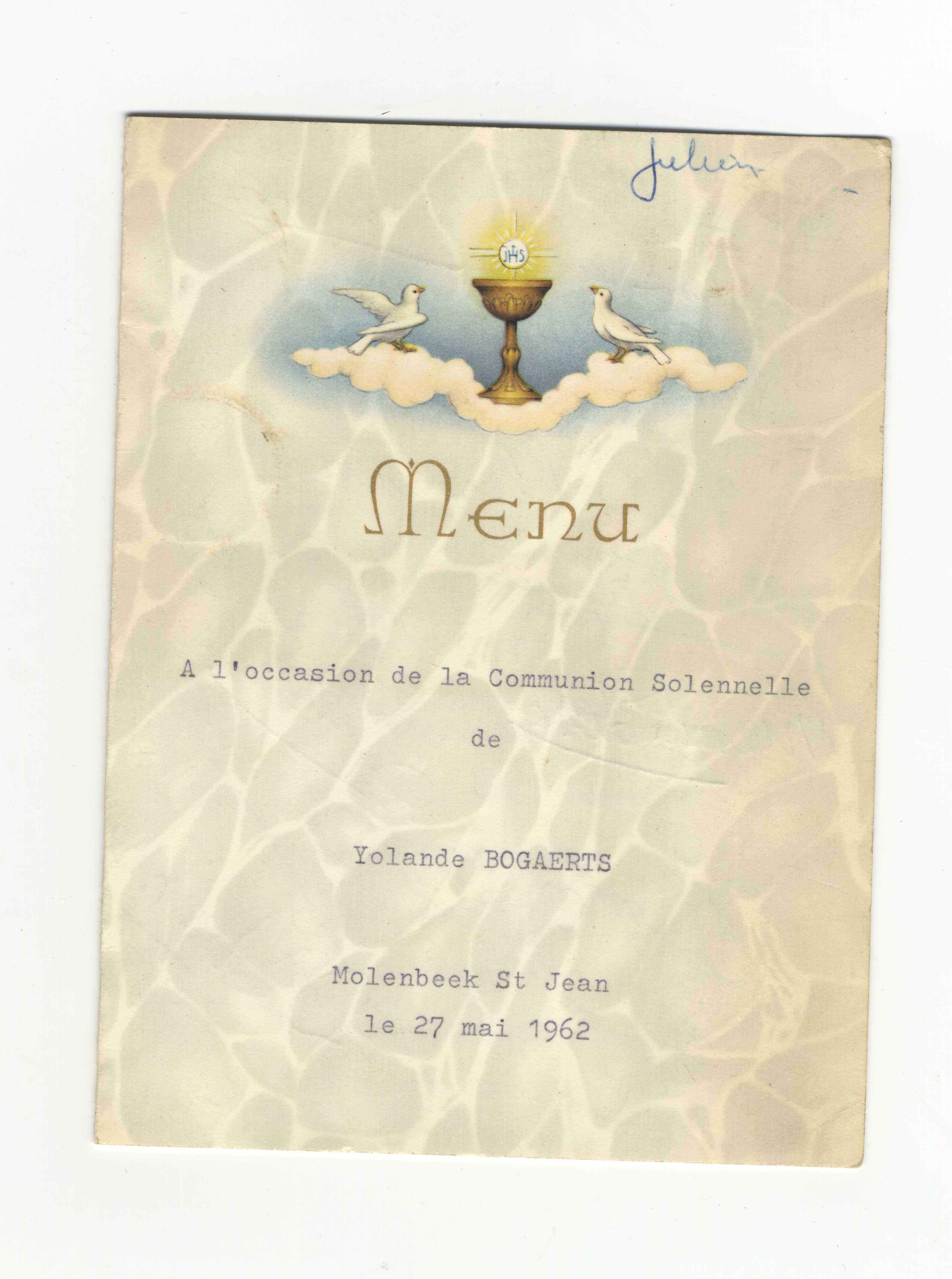 Menu du banquet de Communion solennelle de Yolande Bogaerts, Molenbeek-Saint-Jean, 1962.