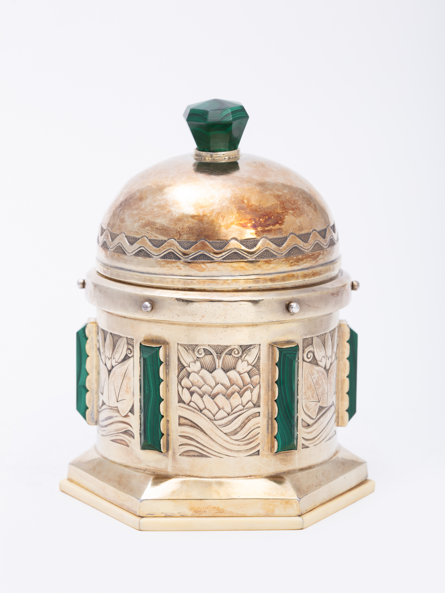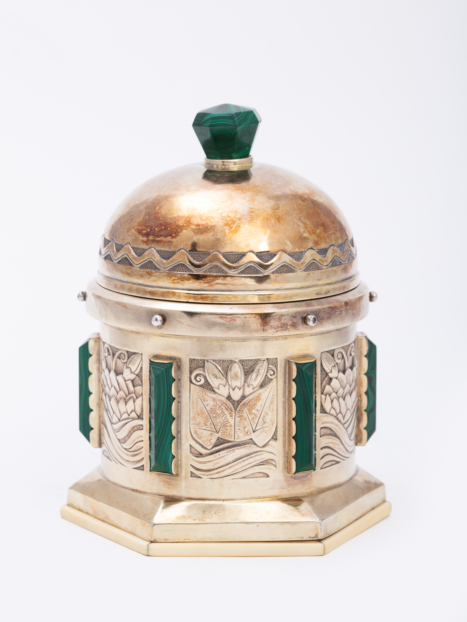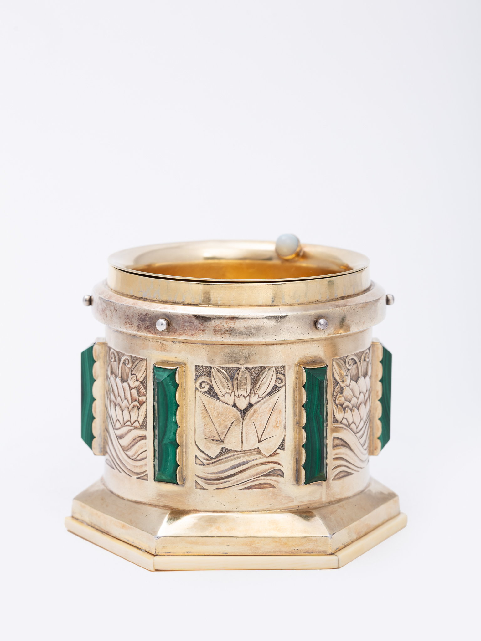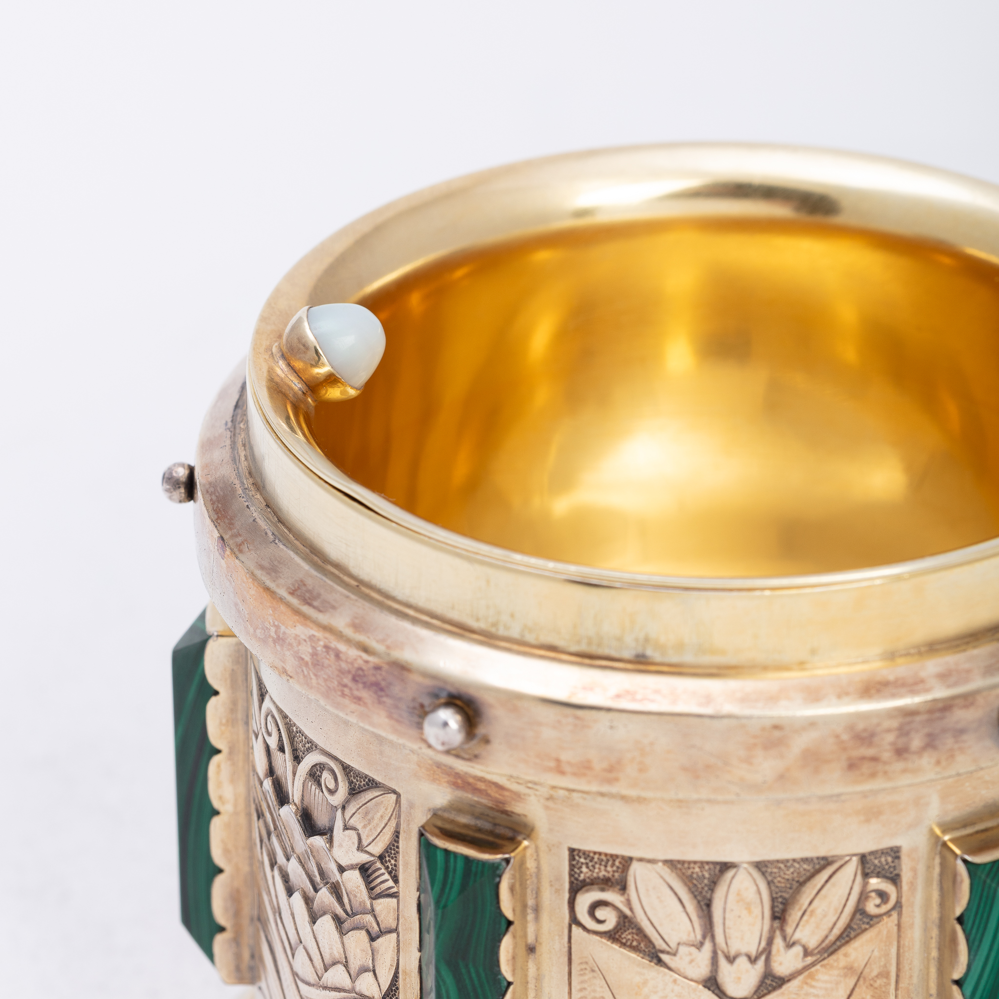 L'objet est réalisé par Joseph Devroye, qui appose son poinçon, et la coupe en cuivre intérieur, avec le bouton en ivoire, aurait été remplacée par Henri-Joseph Holemans.