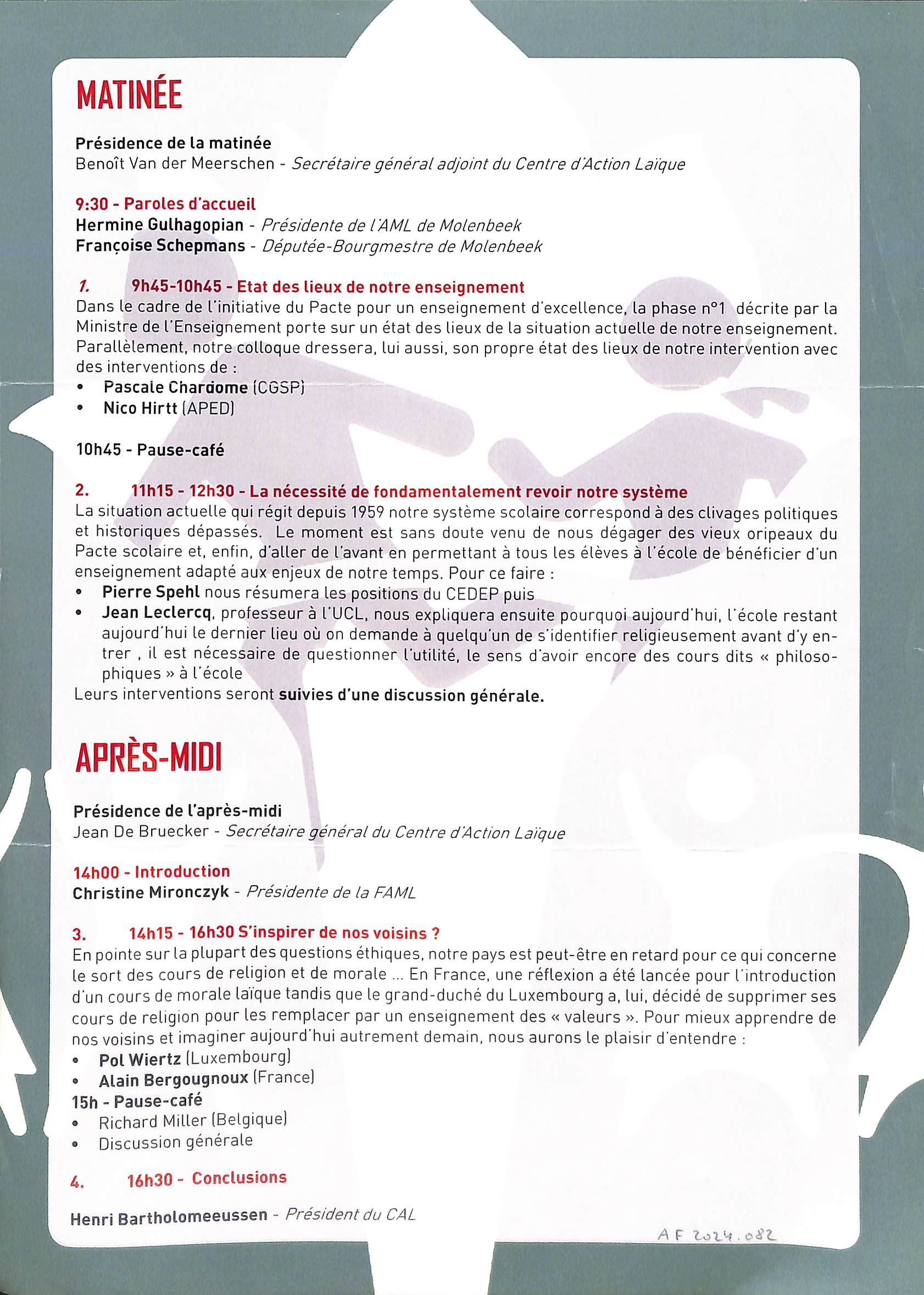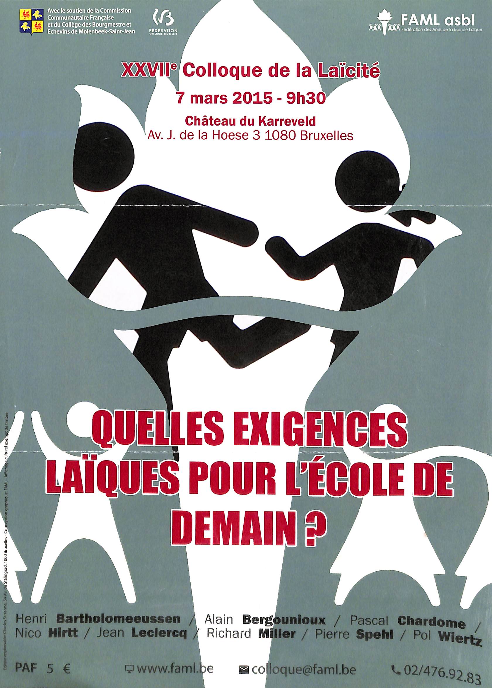 Affiche XXVIIe colloque de la Laïcité : Quelles exigences laïques pour l'école de demain ?, Château du Karreveld (Molenbeek-Saint-Jean), 2015.