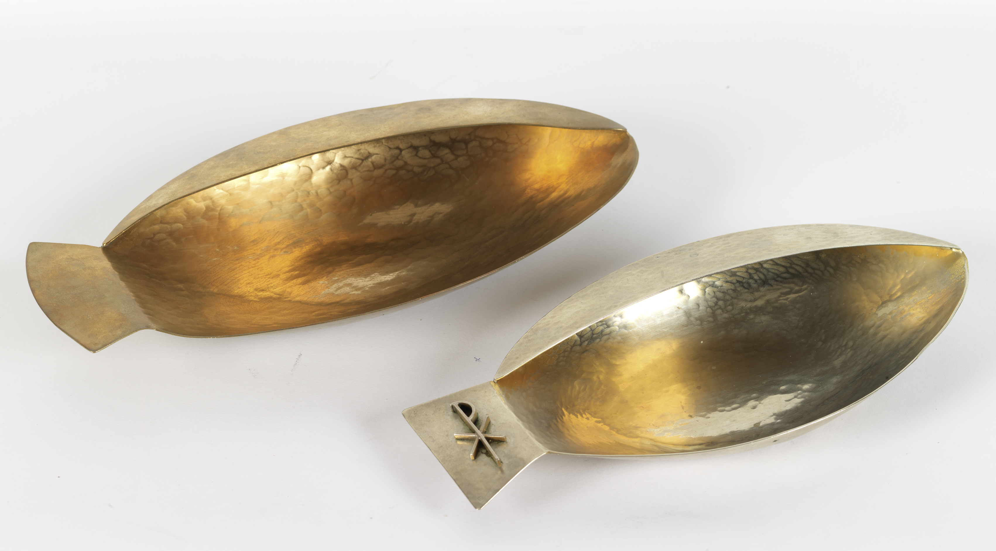 Les deux patènes sont légèrement différentes. L'une est plus grande et d'un aspect plus doré alors que l'autre, avec le Chrisme sur la poignée, est plus petite et d'une couleur plus argentée. L'aspect de surface, martelé, est similaire. Le poinçon est apposé sur les deux patènes, au même endroit.