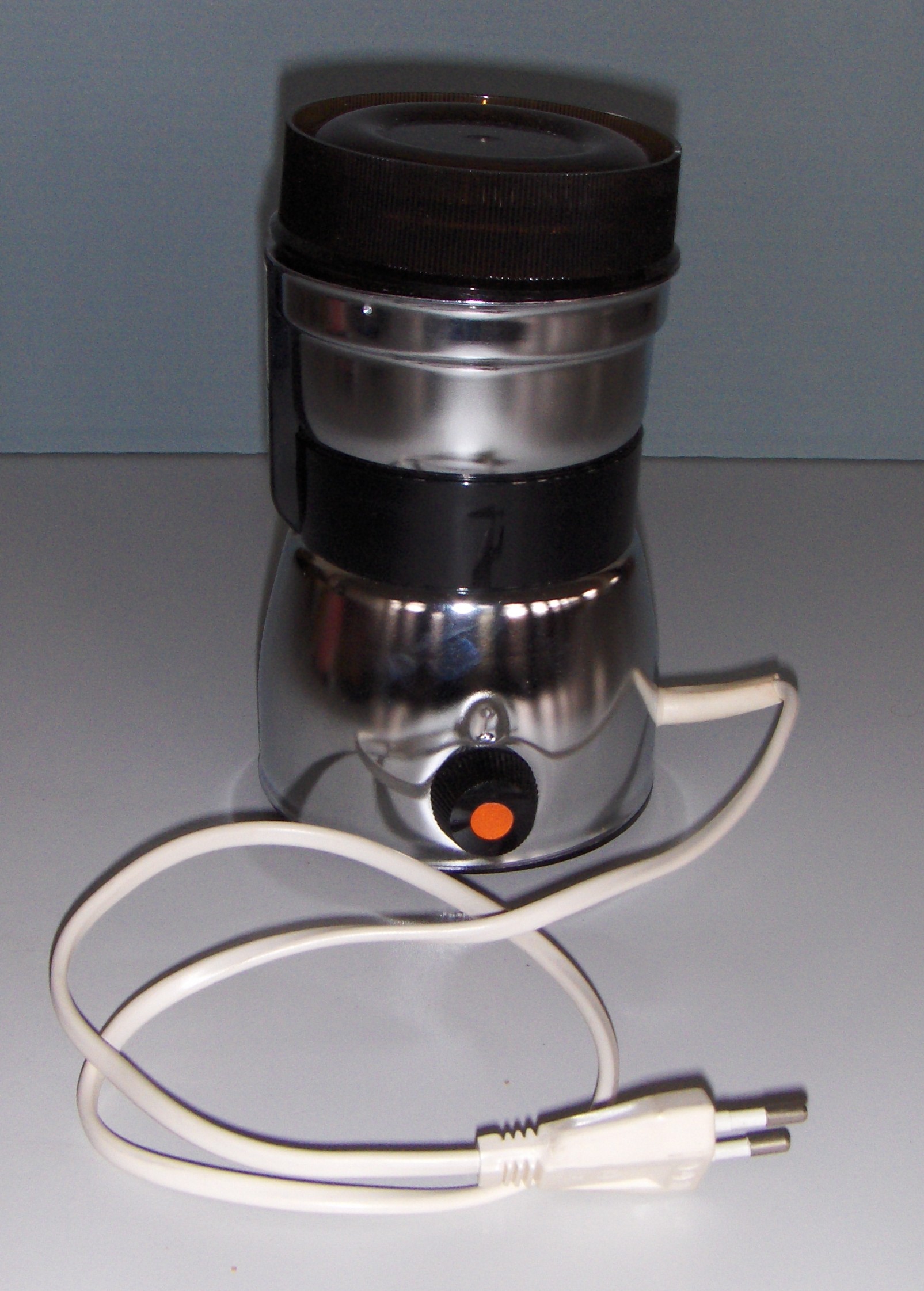 Moulin à café électrique, marque SEB, métal et plastique, 1983.
