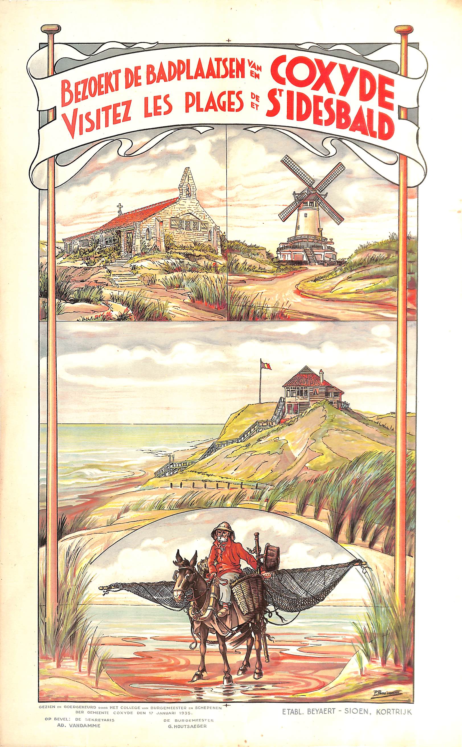 Affiche publicitaire Plages de Coxyde et Saint-Idesbald, impr. Beyaert-Sioen (Courtrai), 1935.