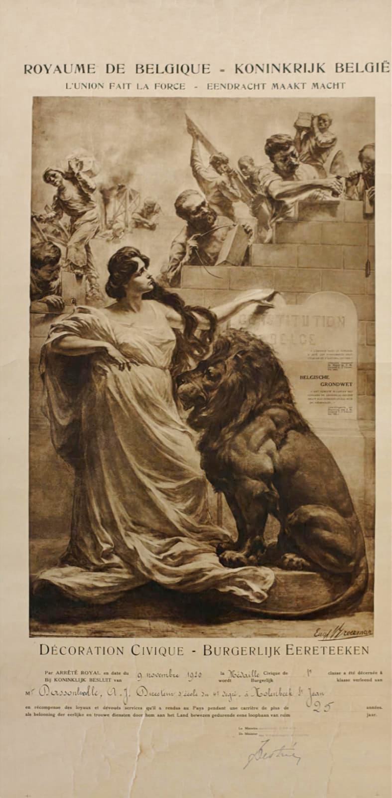 Diplôme de Décoration civique décerné à A.J. Dassonleville, directeur d'école du 4e degré à Molenbeek-Sant-Jean, par le Ministre des Sciences et des Arts, 1920.