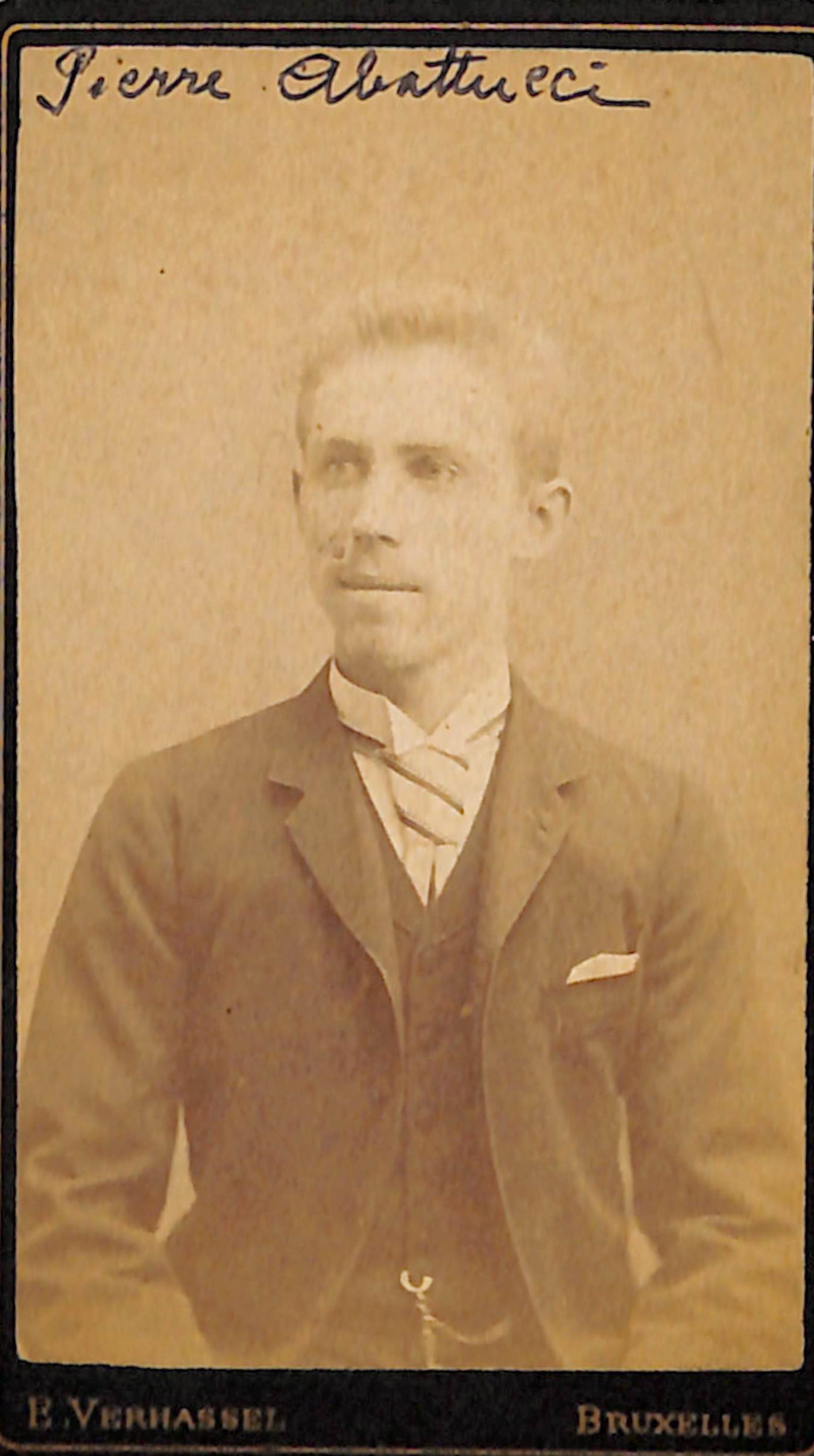 Photo Portrait Pierre Abattucci, peintre molenbeekois, photogr. Egide Verhassel (Molenbeek-Saint-Jean), s.d. [fin 19e siècle].