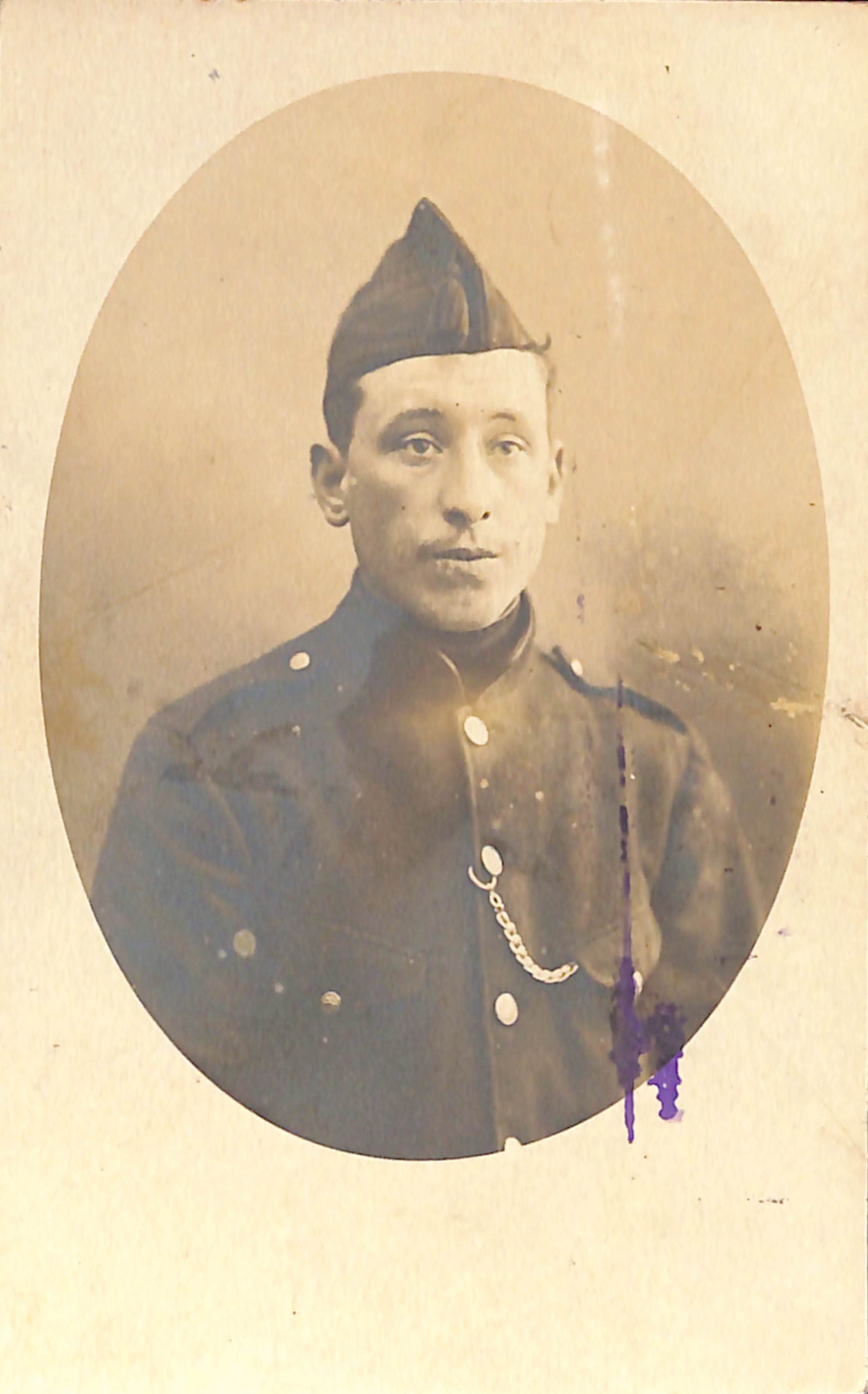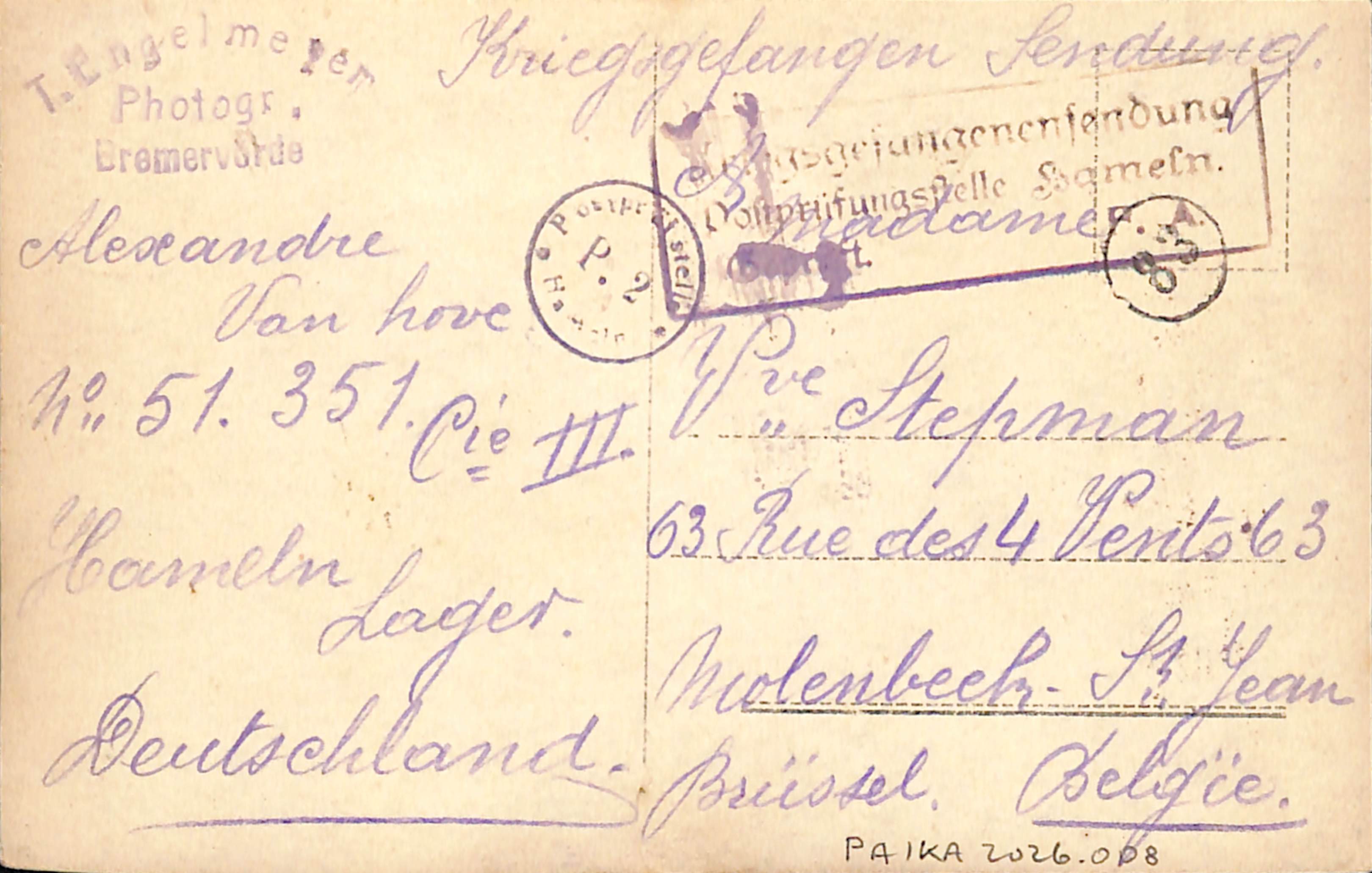 Carte photo Portrait prisonnier de guerre Alexandre Van Hove envoyé du camp de Hameln à Molenbeek-Saint-Jean, photogr. T. Engelmeyer (Bremervörde), s.d. [1914-1918].