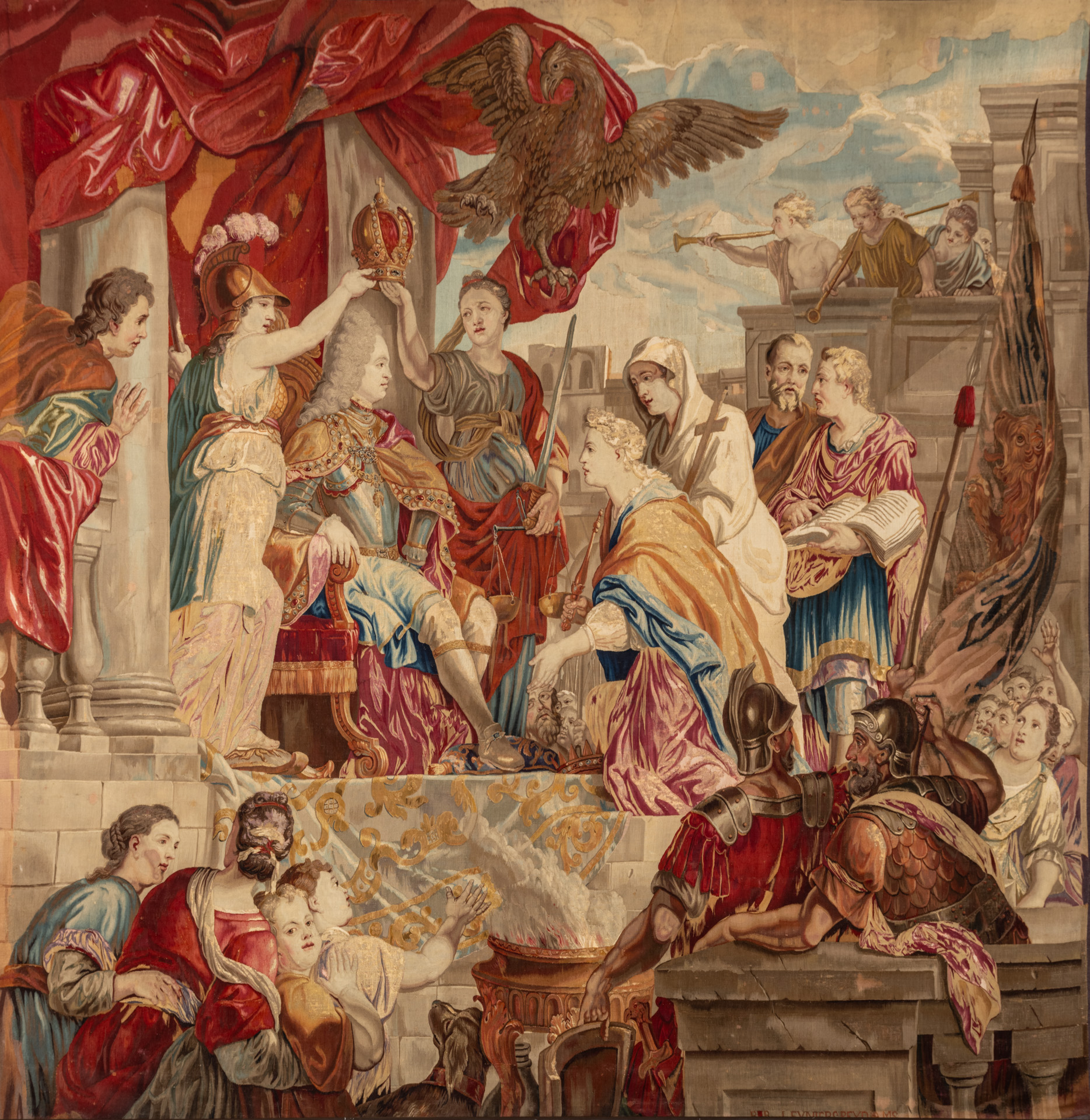 Charles est couronné par la Force et la Justice. Devant lui s'inclinent la Puissance et la Foi.