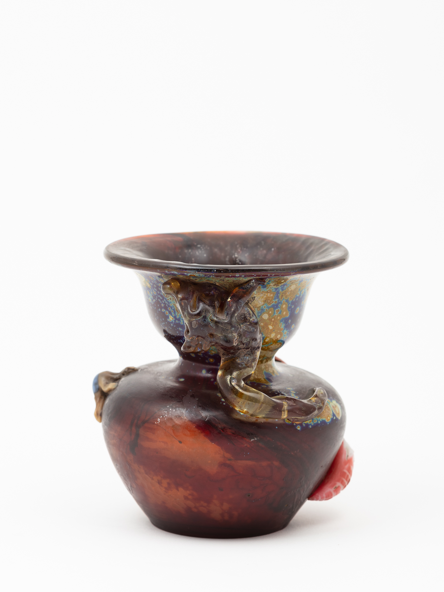 Vase, verre soufflé à plusieurs couches violacées, marqueteries de verre gravé, partiellement métalisée, applications modelées et fixées à chaud.