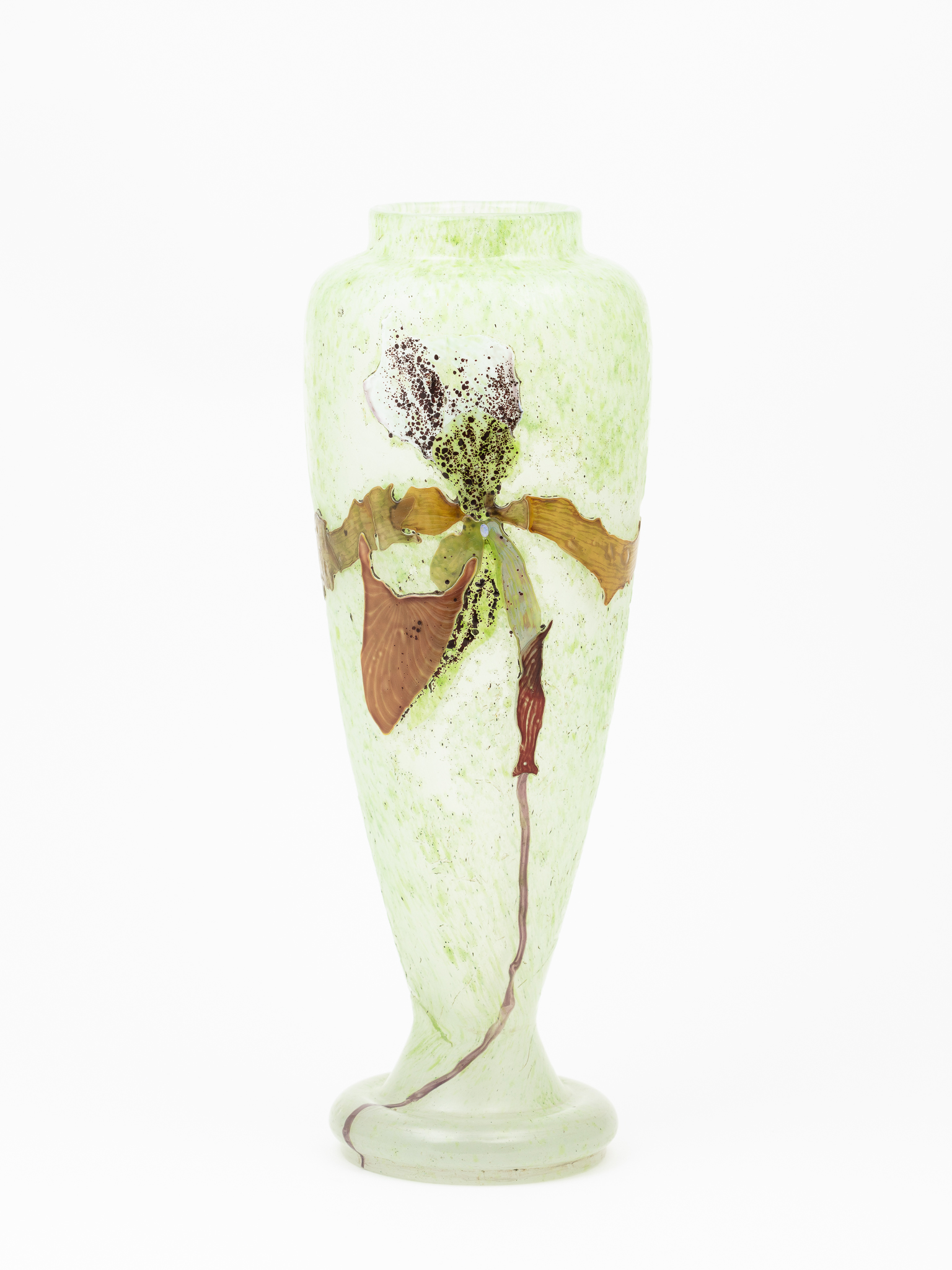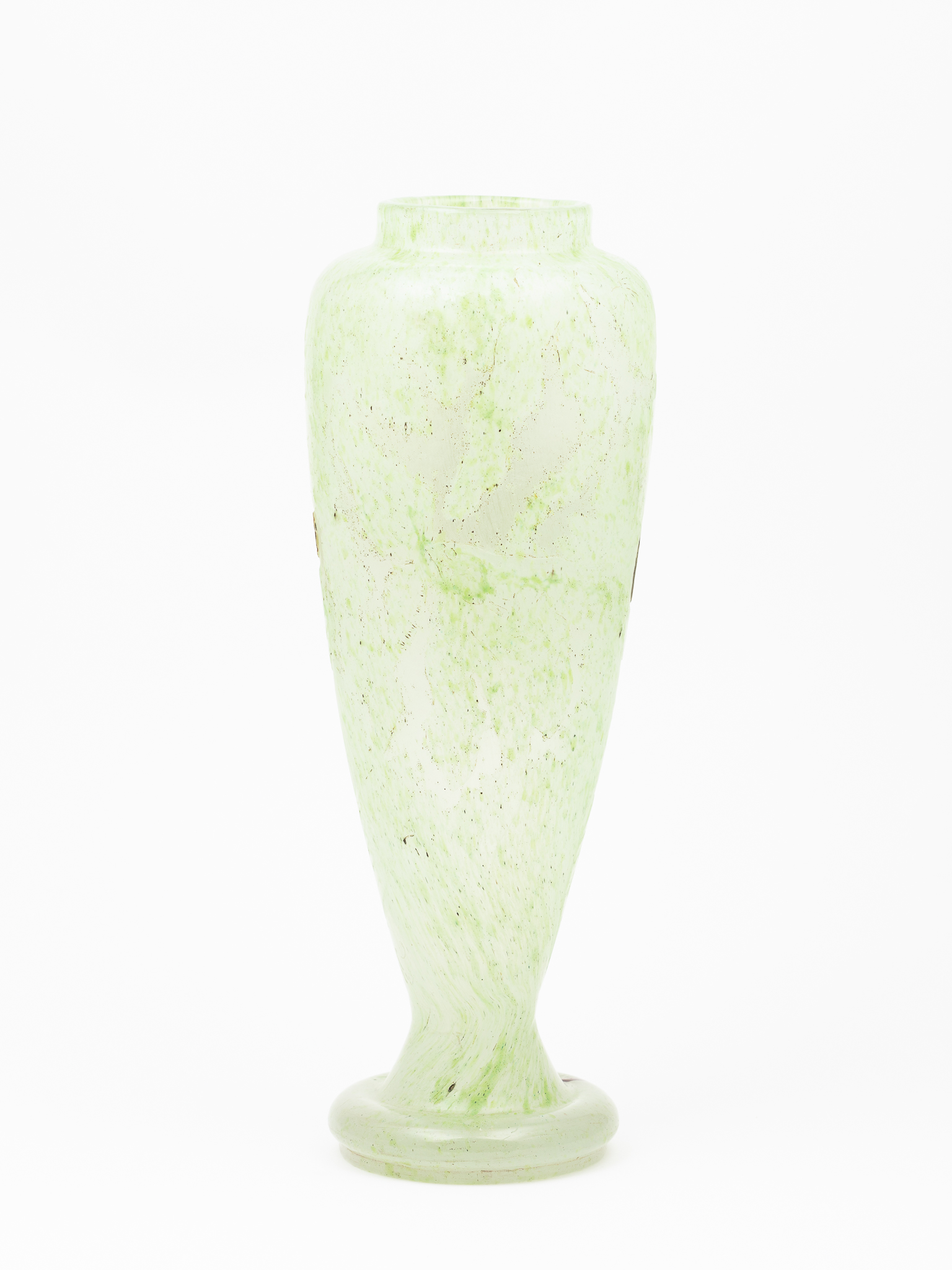 Vase, verre multicouche rehaussé d'une opale, ornementé de traînées d'oxyde en intercalaire, marqueteries de verre, fines ciselures à la meule