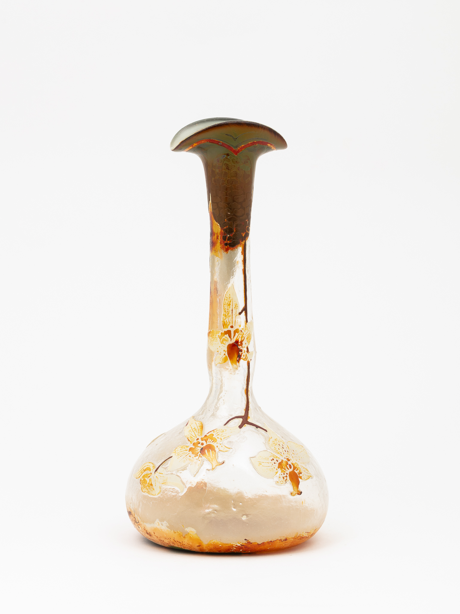 Vase, verre doublé et dévitrifié, gravé à l'acide fluorhydrique, décors d'émaux colorés métallisés par vapeur d'oxyde