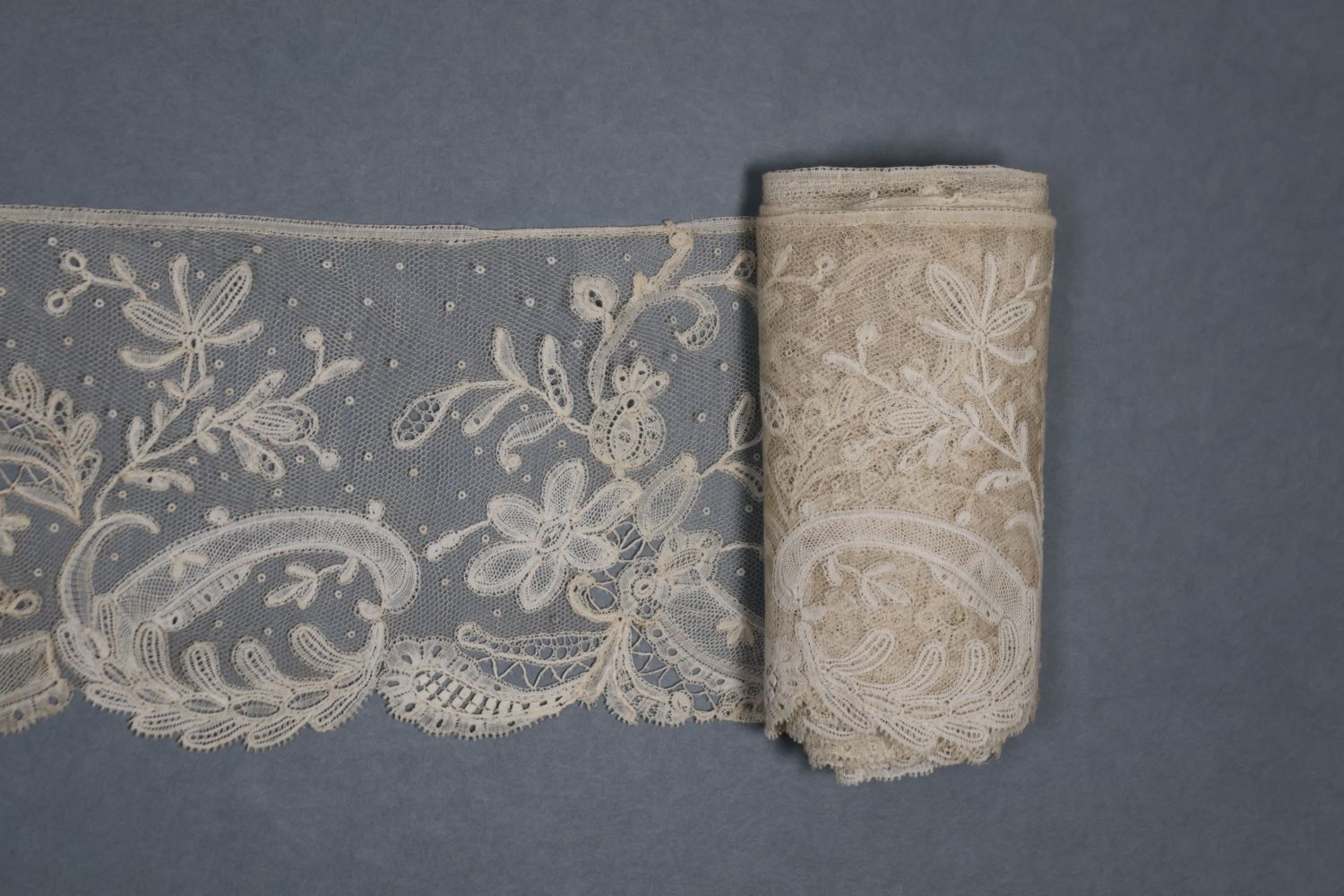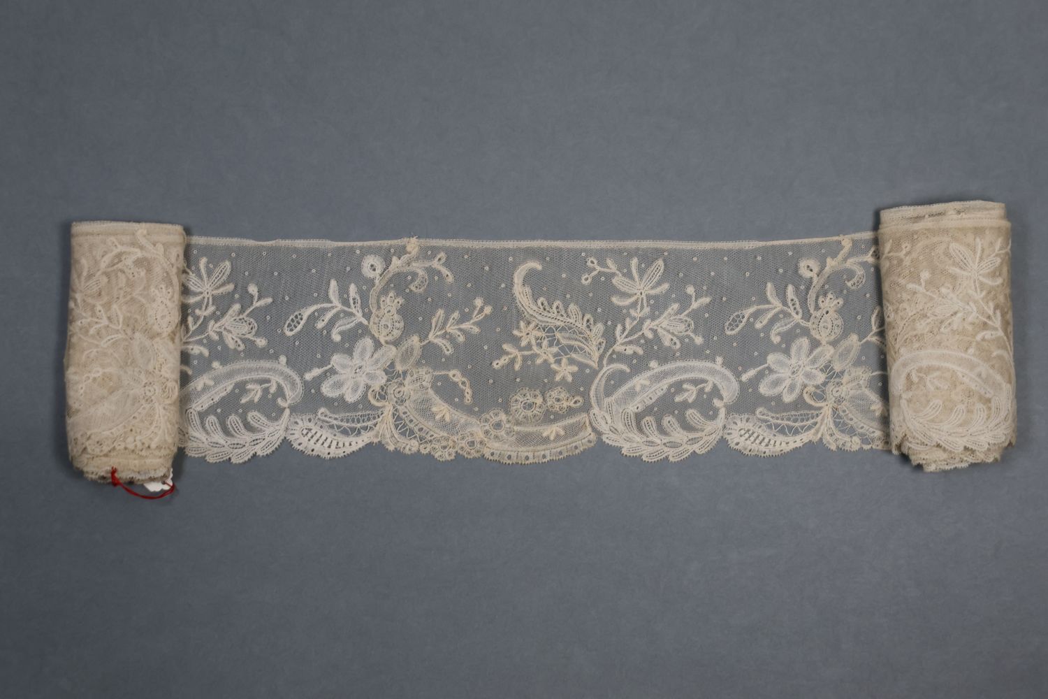 Motifs floraux et présence d'arabesques plus ornemantales sur le bord inférieur de la pièce. Deux motifs de bouquet se succèdent l'un après l'autre.