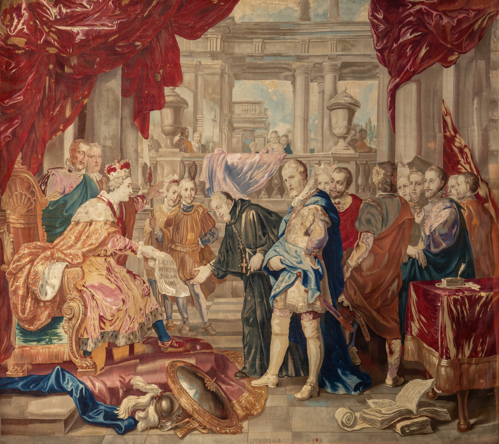Philippe le Bon (assis sur son trône), duc de Bourgogne (de 1419 à 1467, remettant la Joyeuse Entrée (charte constitutionnelle) aux Etats, c'est à dire aux représentants du clergé, de la noblesse et de la bourgeoisie des chefs-villes du duché (Bruxelles, Louvain et Anvers) lors de son avènement au trône.