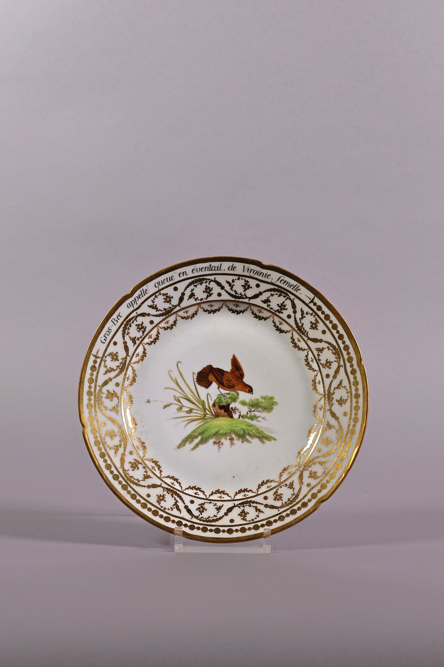 Assiette aux oiseaux d'après Buffon - Gros-Bec appellé queue en éventail de Virginie, femelle