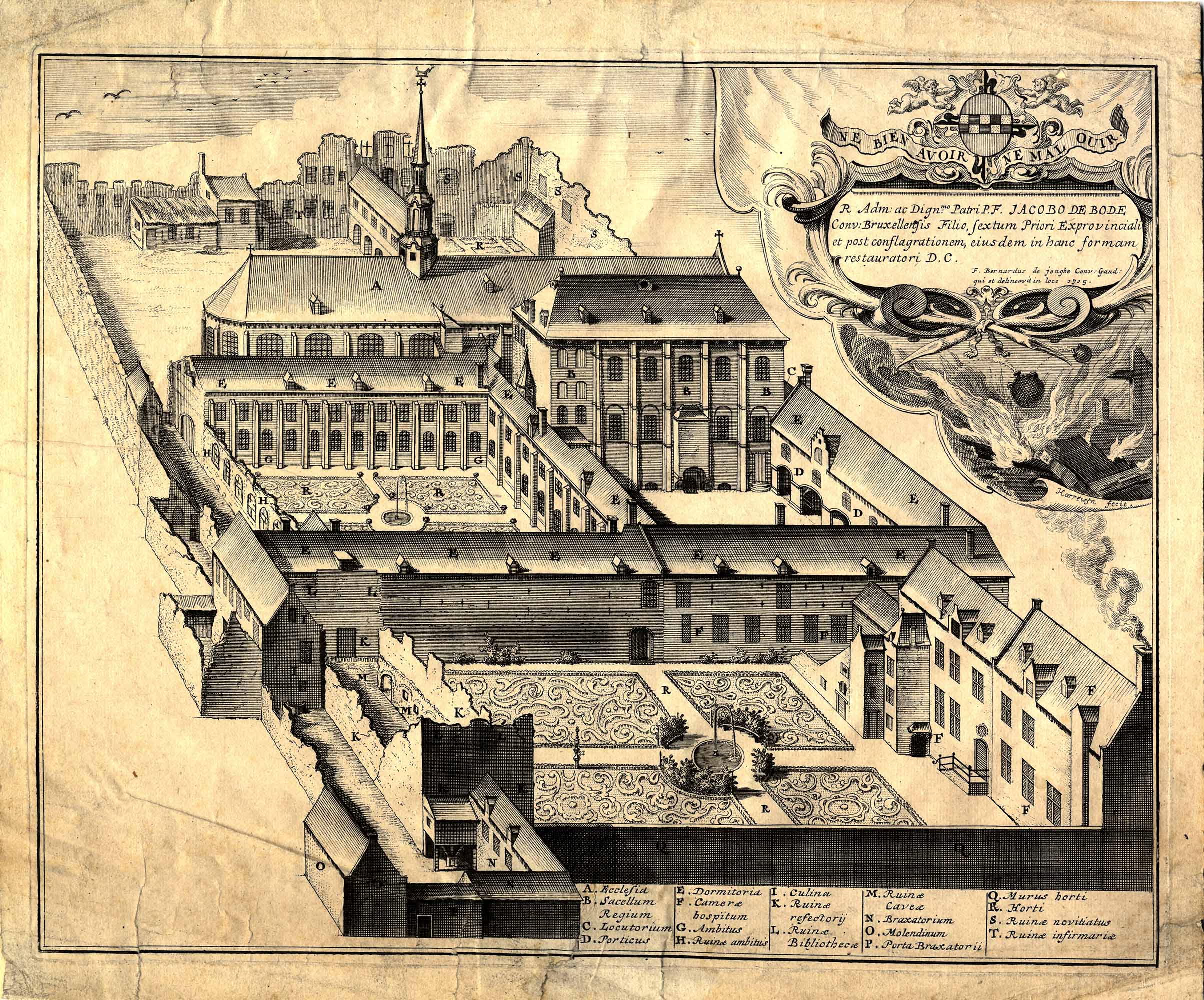 "R Adm: ac Dign:mo Patri P. F. JACOBO DE BODE Conv: Bruxellensis filio, sextum priori exprovinciali et post conflagrationem, eiusdem in hanc formam restauratori D. C. F. Bernardus de jonghe Conv: Gand: qui et delineavit in loco 1715. " (En haut dans l'estampe, à la côté droite)