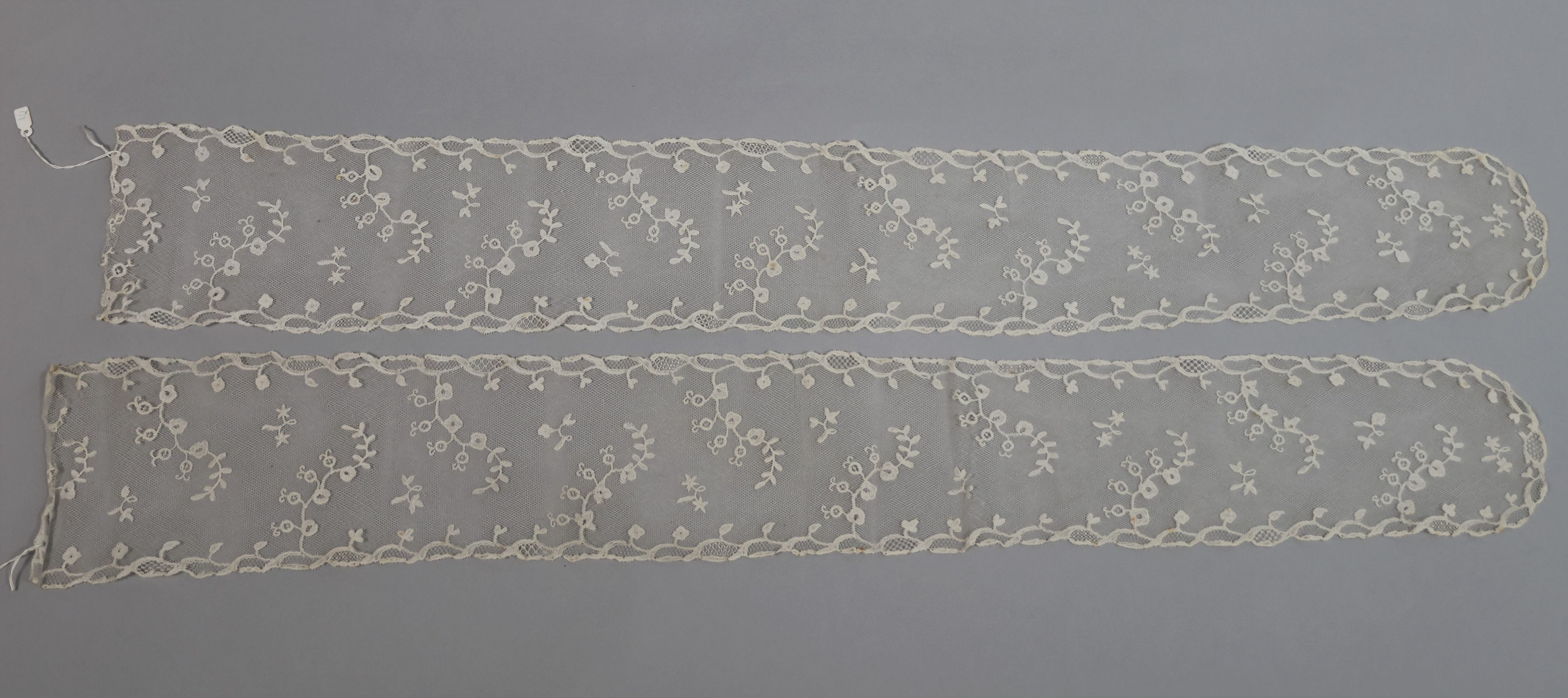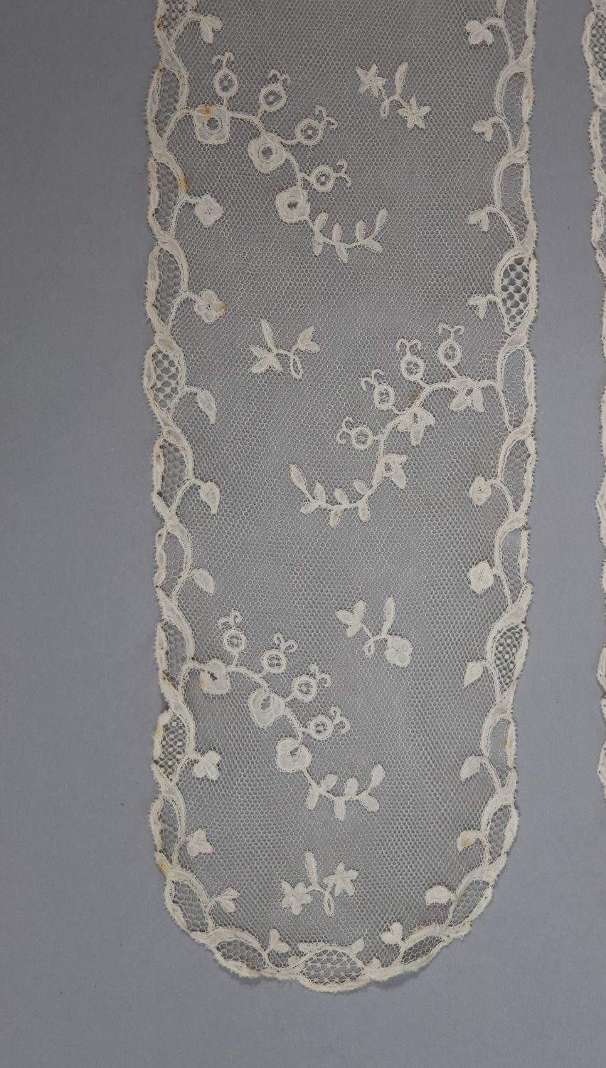 Dentelle de Bruxelles, application aux fuseaux sur fond drochel. Barbe à bout arrondi. Bord formé par une guirlande rythmée par des médaillons dont les centres présentent des points variés et d’où s’échappent à intervalles réguliers sans symétrie parfaite des feuilles, fleurettes et légers bouquets. Le décor, appliqué sur un fond drochel, est constitué de ces bouquets revenant au centre entre lesquels il y a un semis de fleurs et d’étoiles.