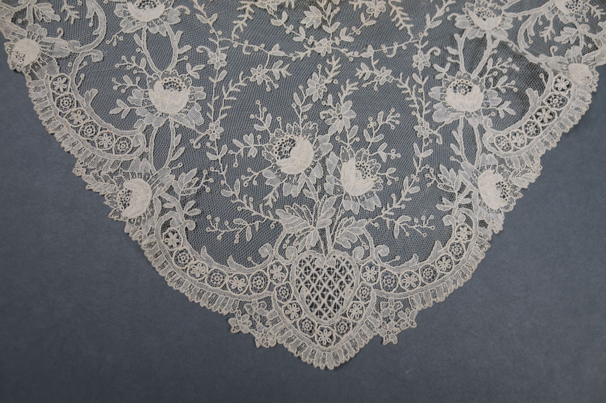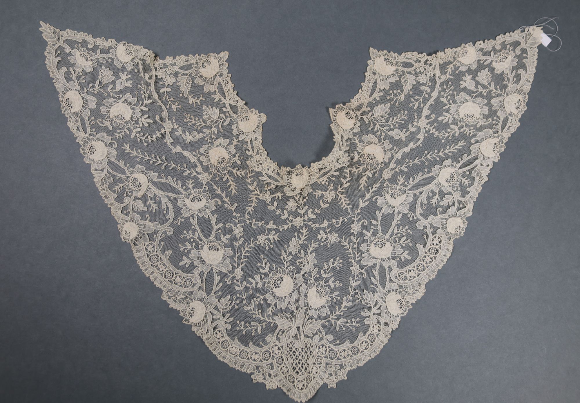 Guimpe ornée de rinceaux fleuris, de roses épanouies aux pétales en relief, de rocailles ajourées et d’un motif en coeur à la pointe médiane, portée par Madame Mouton-Lagrange lors de son mariage en 1912.