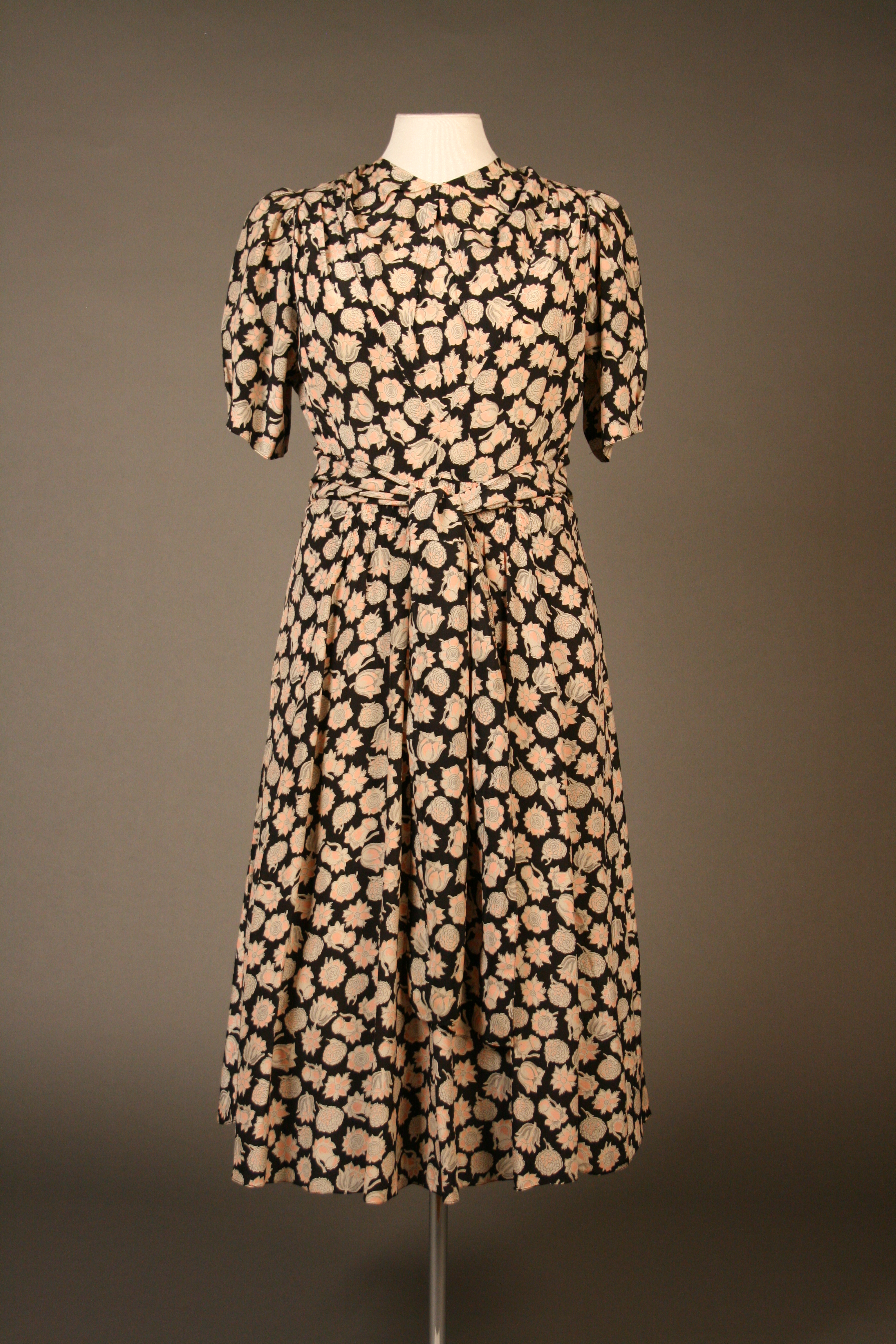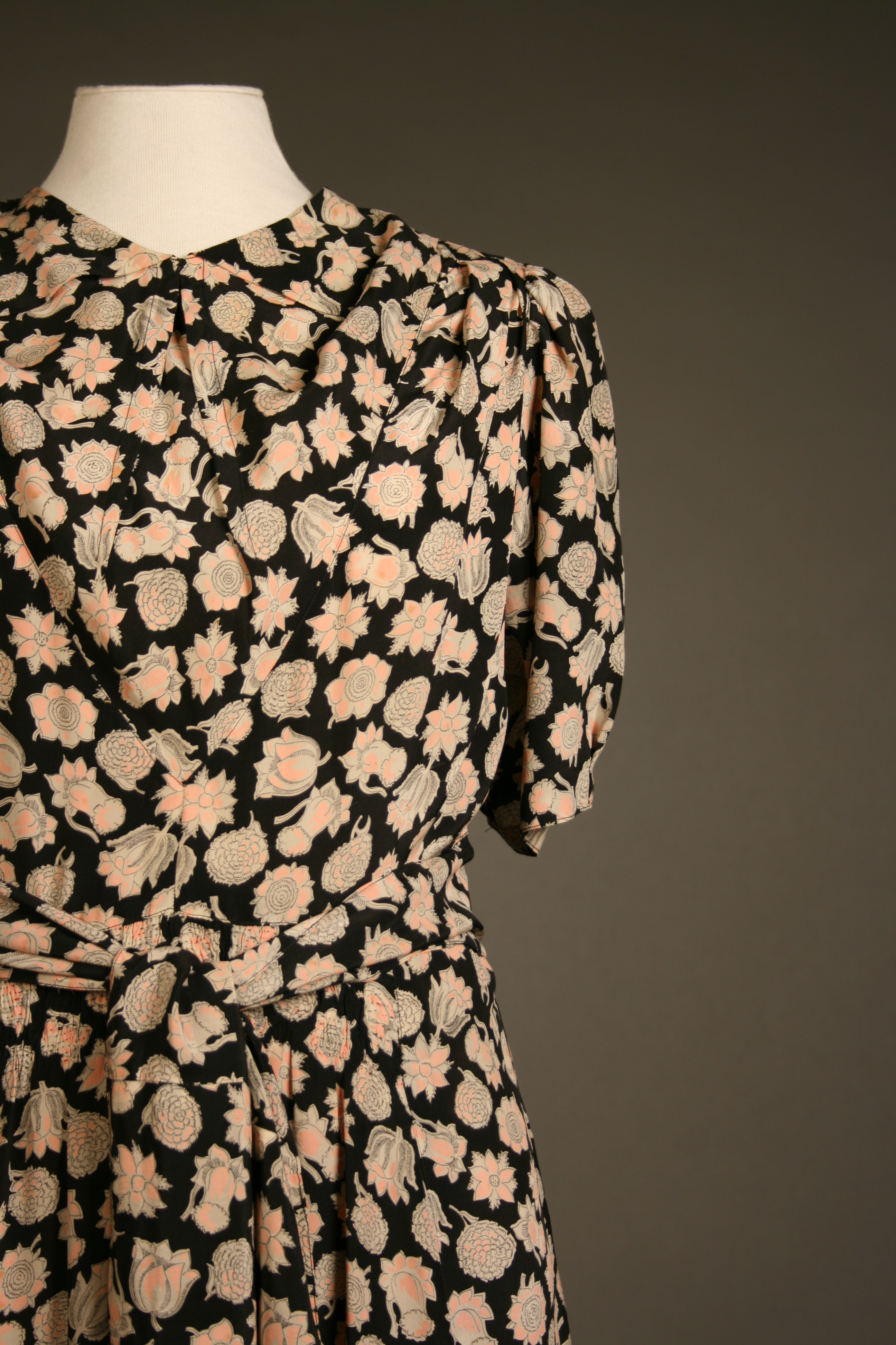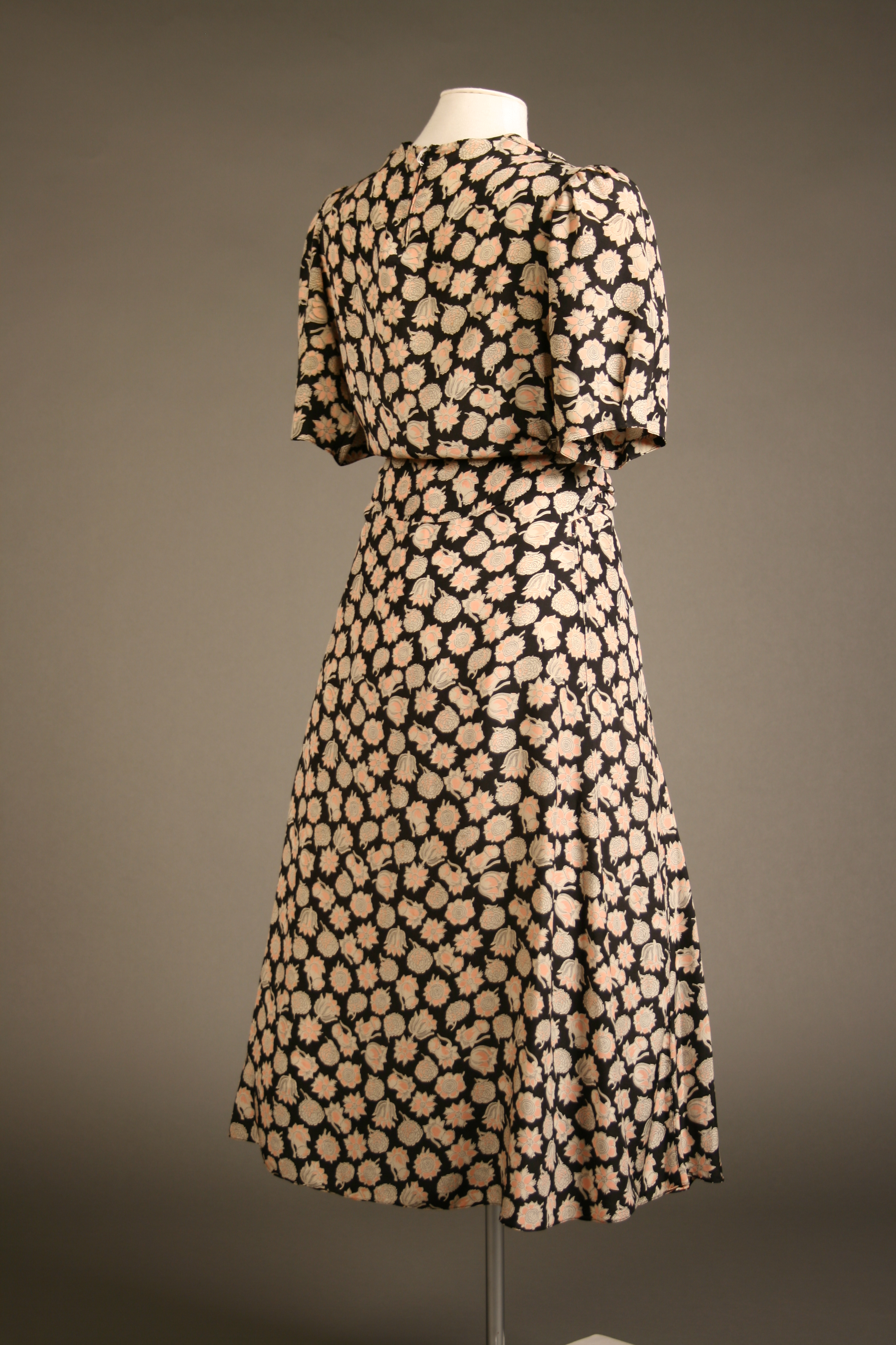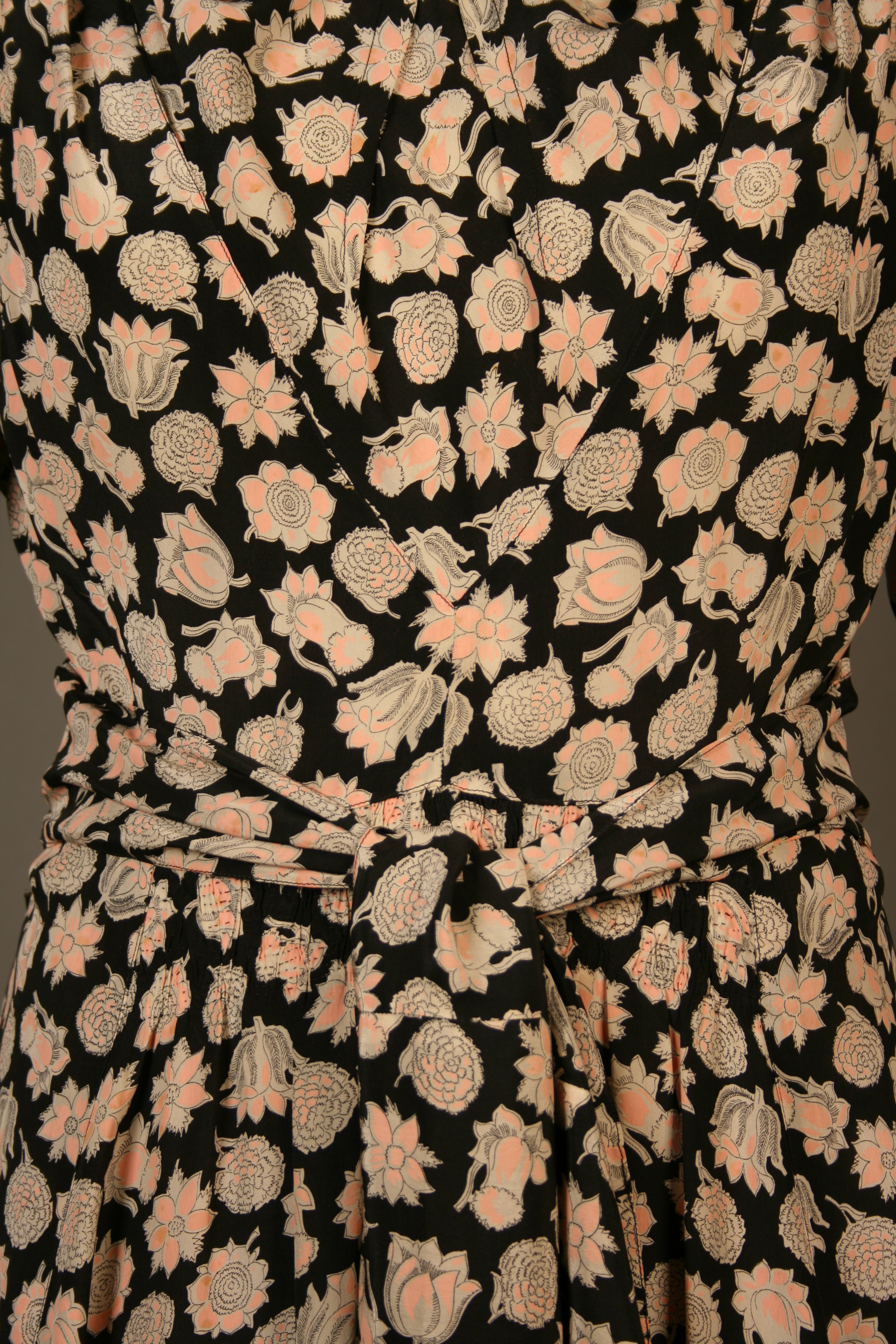 Faille de soie à fond noir imprimé de fleurs grises rehaussées de rose (narcisses, oeillets, anémones, jonquilles, tulipes). Corsage à manches courtes, incrustations triangulaires formant chemisier devant. Jupe en forme, panneau à l'avant froncé à la taille qui lui donne de l'ampleur. Ceinture incrustée nouée devant.