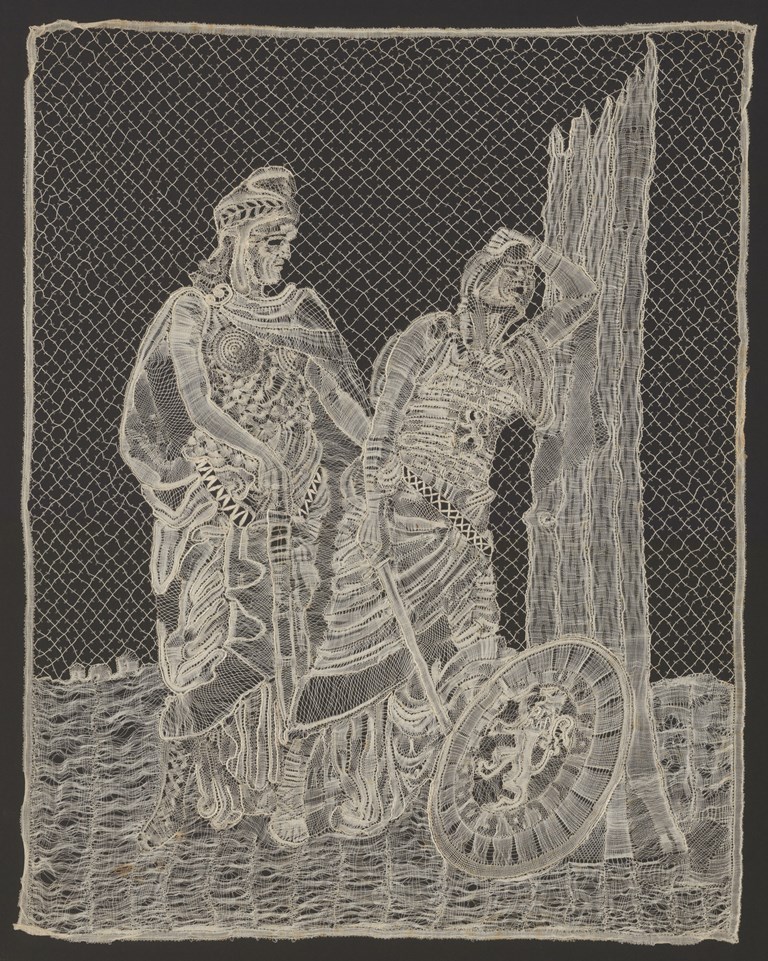 Louise Liénaux-Vergauwe (1890-1974), professeur à l'école professionnelle d'Anvers, réalisa six dentelles engagées entre 1915 et 1919, toutes aux fuseaux. Véritables tableaux à la composition originale et percutante, elles se différencient des nombreuses pièces patriotiques que l'on voit habituellement dans les collections publiques et qui prennent la forme traditionnelle de la nappe ou du napperon. L'effet de réalisme dans le rendu des ombres et du relief rappelle la technique de la gravure et place ses œuvres à l'origine de la dentelle contemporaine.