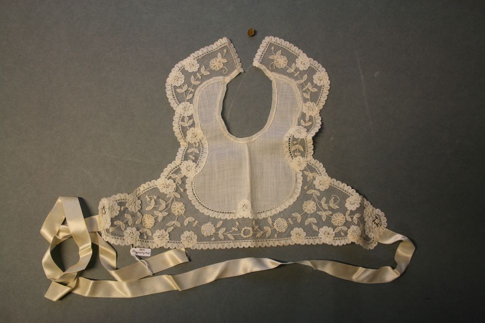 Tulle brodé de dentelle au lacet avec empiècement de batiste de coton sur le milieu. Ruban de satin permettant de fixer le bavoir dans le dos.