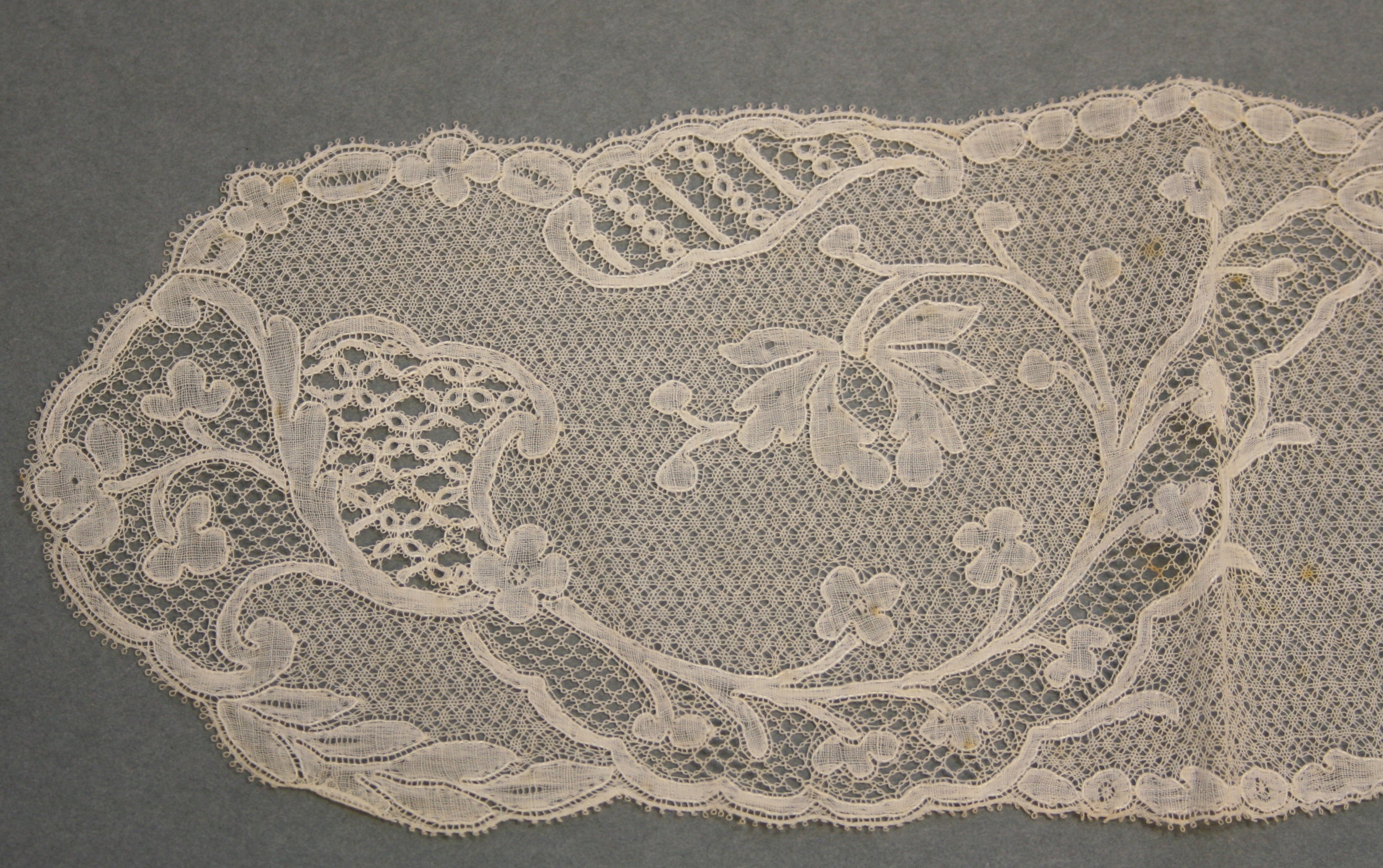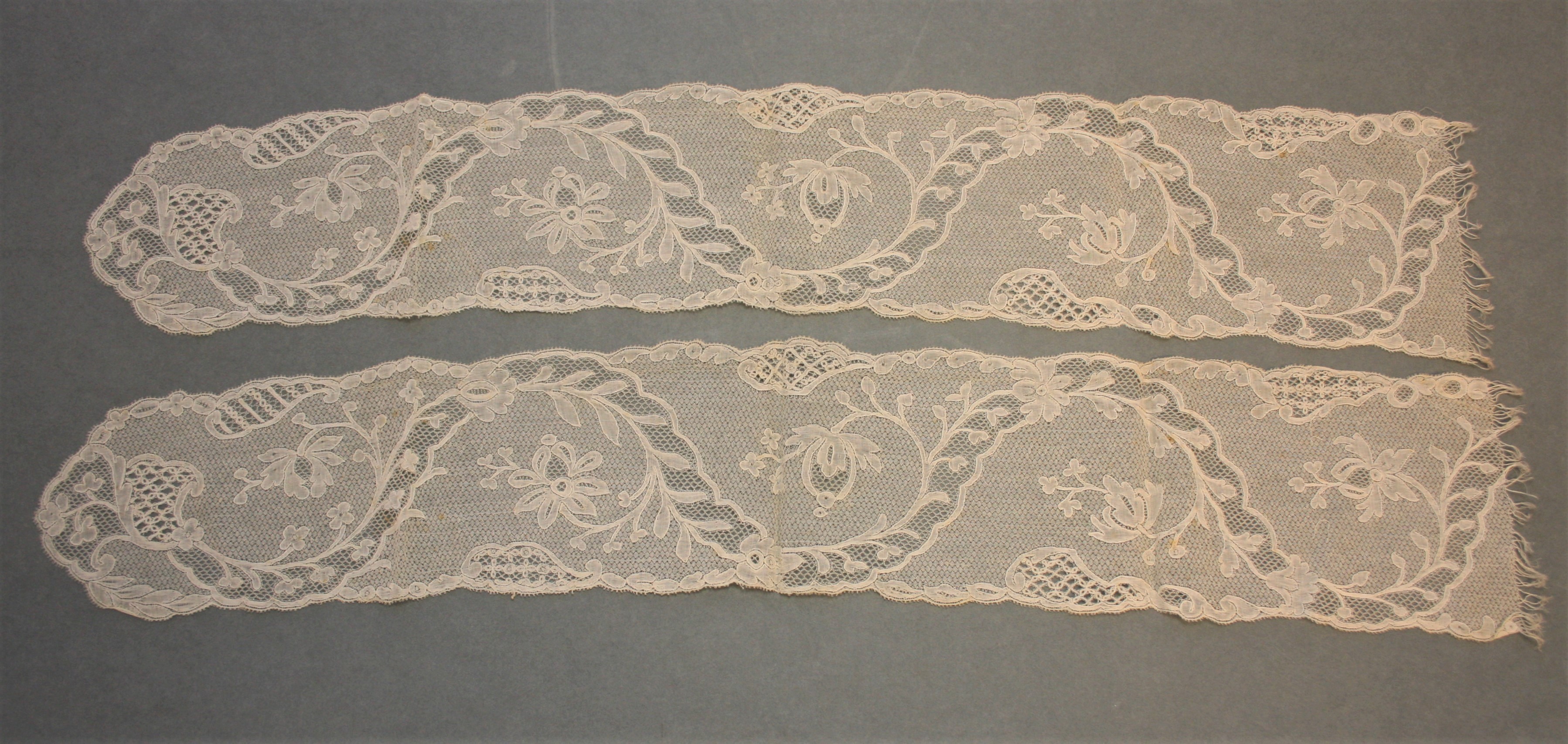 Dentelle aux fuseaux à fils continus et contour (Binche ou Valenciennes), très fin fond de neige et grillé. Motif de rivière ondulante alternant fleurs et feuillages, bord arrondi.