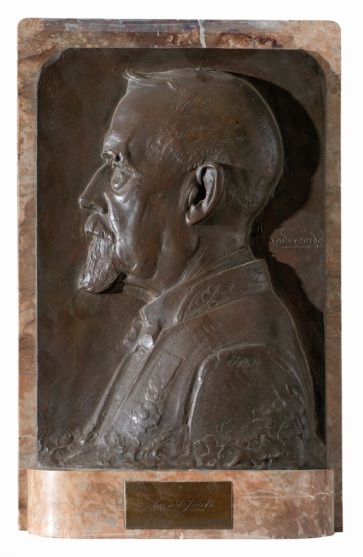 Georges Vandevoorde, Buste d'Auguste Smets, échevin de l'Instruction publique à Molenbeek-Saint-Jean, bas-relief en bronze, socle en marbre, s..d. [1936 ?].