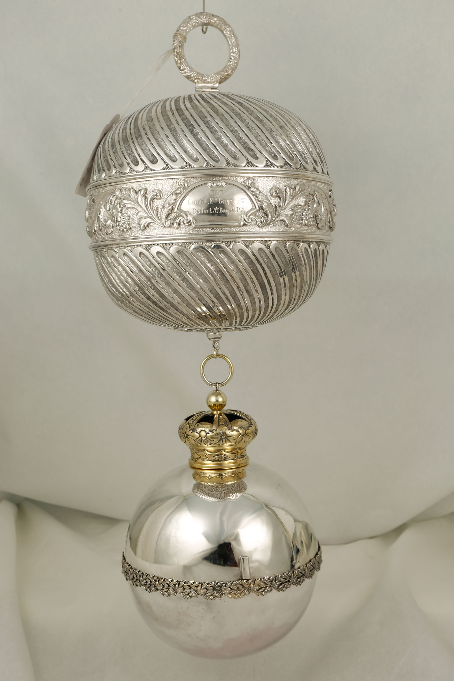 La grande balle est ornée d'une frise au décor végétal travaillé au repoussé et de deux médaillions inscrits.
