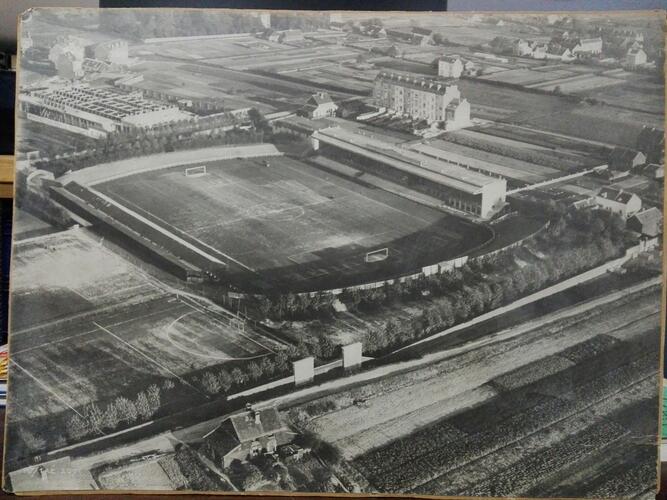 Photo aérienne Stade de football du Daring et manufacture de tabacs AJJA (Molenbeek-Saint-Jean), photogr. anon., s.d. [vers 1920].