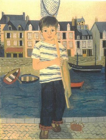 Cette oeuvre de Micheline Boyadjian ne renie pas le courant artistique que l'artiste a adopté tout au long de sa carrière, l'art naïf. Le garçonnet est représenté épuisette à l'épaule, un gros crabe aux pieds, devant le chenal où stationnent plusieurs barques. La plus grande porte un nom qui relève du vocabulaire italien, "ricola". A l'arrière, des maisons et boutiques en rang le long du quai. Le pare-soleil de la première porte un nom, "arnanik", qui provient du langage inuit. Il va sans dire que la perspective est volontairement faussée et que le style contient à dessein une note enfantine.
