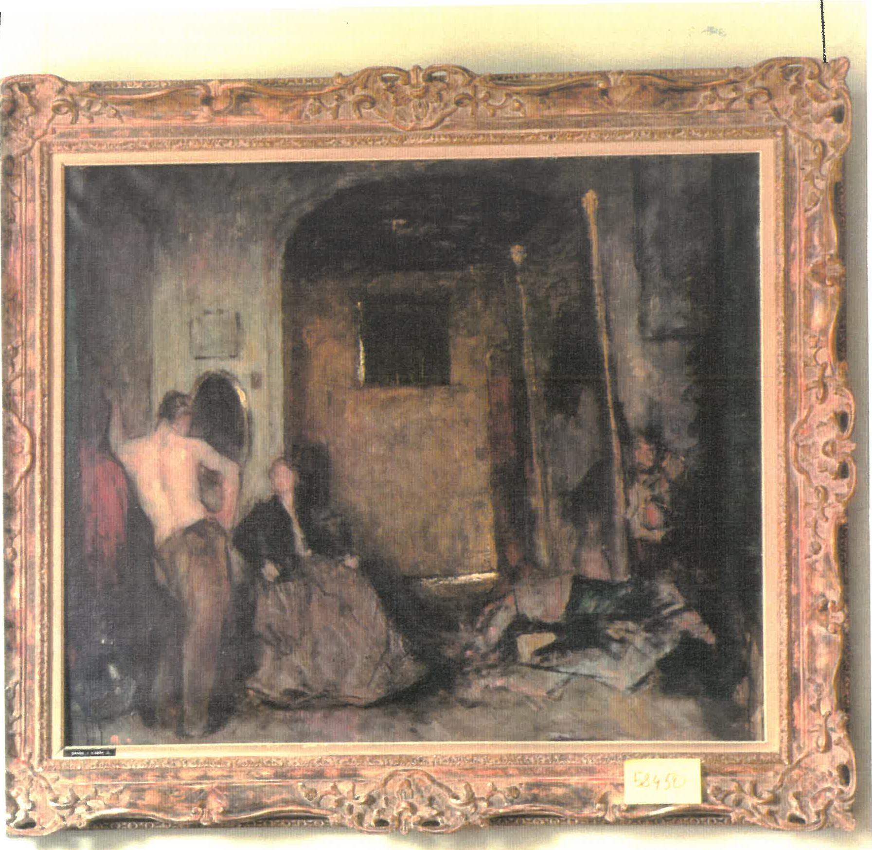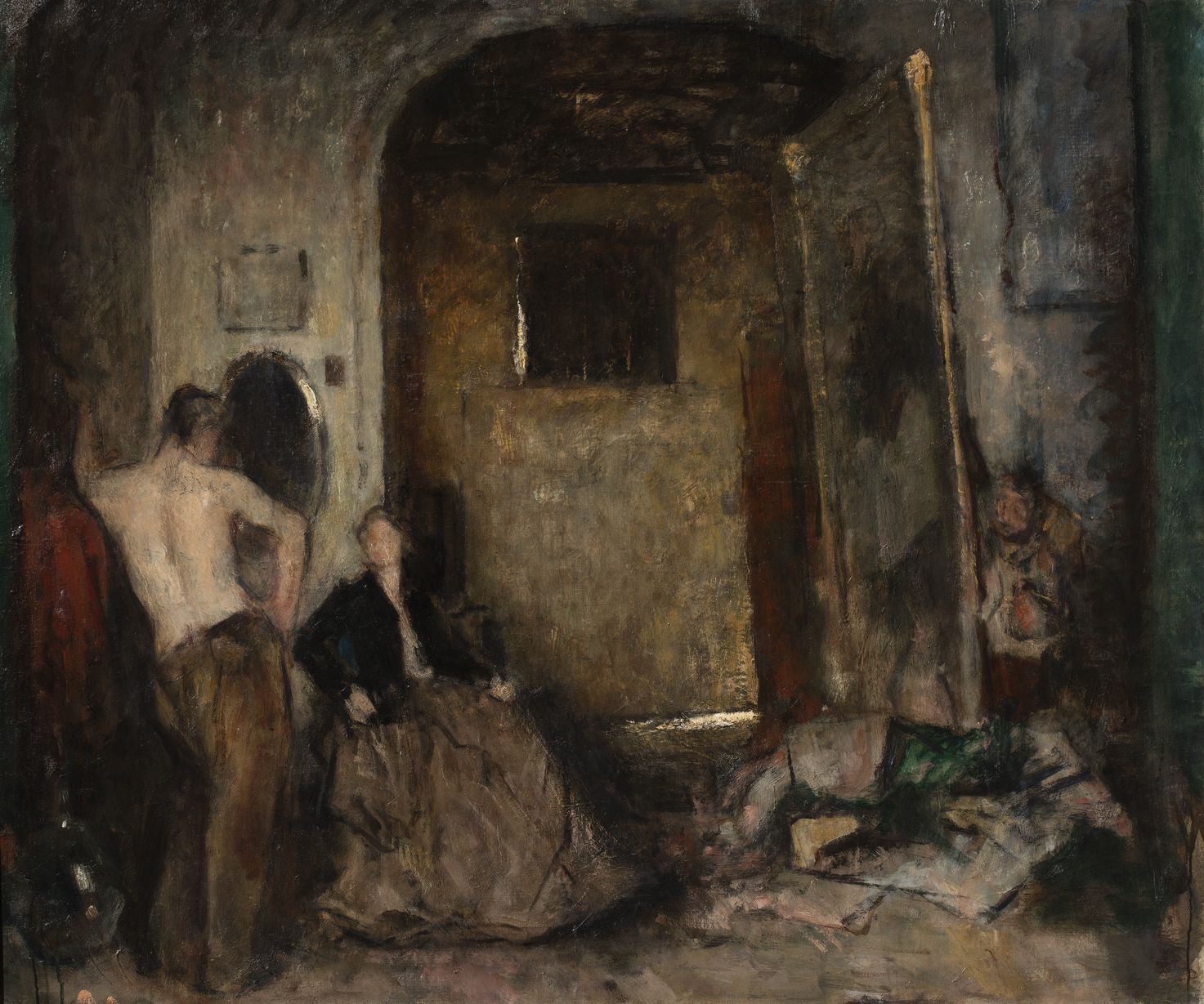 Le thème de l'atelier est revisité par le peintre sous sa forme décontractée. L'artiste (est-ce lui ?) semble affairé à maintenir droit un grand portrait de commande à la vue de la commanditaire retenant sa jupe longue, dont le regard absent semble tourné vers un modèle qui semble attendre nonchalamment de pouvoir reprendre la pose. Malgré le réalisme du trait, aucun personnage n'est reconnaissable, les visages étant comme effacés. Malgré la présence de couleurs chatoyantes dans cet atelier de peintre, tout est plongé dans la pénombre. Façon de voir l'atelier.
