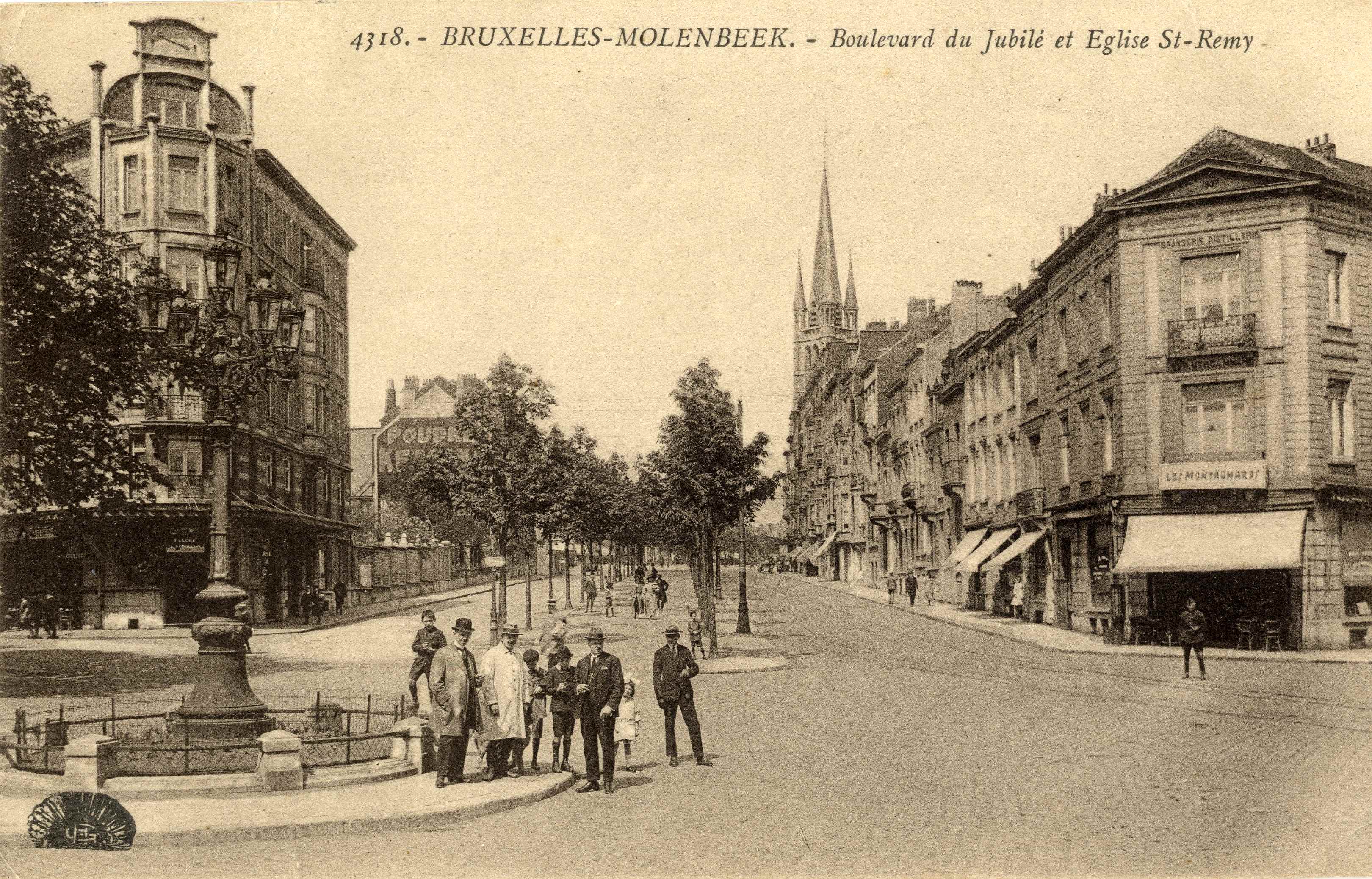 Carte-vue Boulevard du Jubilé et Eglise Saint-Remi, brasserie "Les Montagnards" de F. Vercammen (Molenbeek-Saint-Jean), éd. Henri Georges (Bruxelles), 1927.