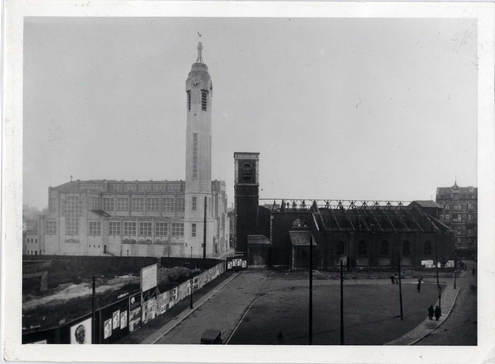 Photo Eglise Saint-Jean-Baptiste de Molenbeek-Saint-Jean face à l'ancienne église en démolition, photogr. anon., s.d. [vers 1932].