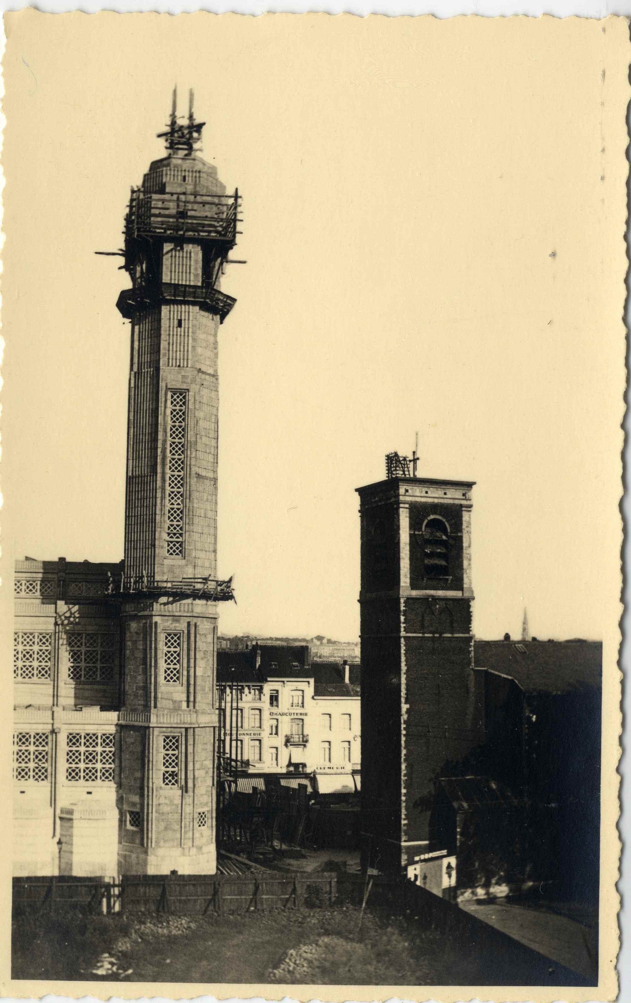 Carte photo Eglise Saint-Jean-Baptiste en construction face à l'ancienne église (Molenbeek-Saint-Jean), photogr anon., s.d. [vers 1931-1932].