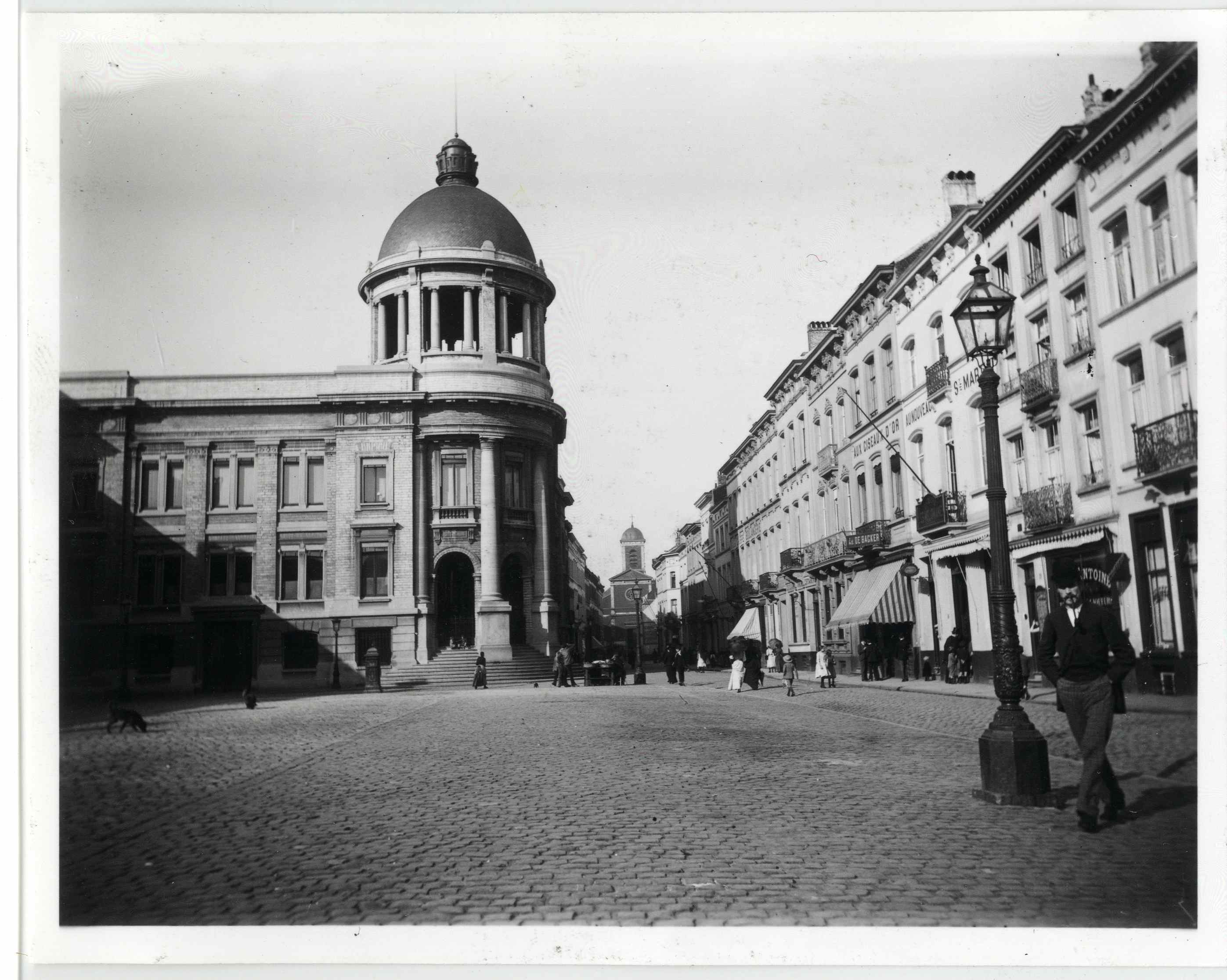 s.d. (Une première mention du marchand-tailleur Ed. De Backer (Place Communale, 17) et de son enseigne "Aux ciseaux d'or" du tailleur dans l'édition 1905 de l'Almanach du Commerce et de l'Industrie qui mentionne également l'enseigne du café "Au nouveau St. Martin" (Place Communale, 18) tenu par le marchand de bière J. Mulders.)