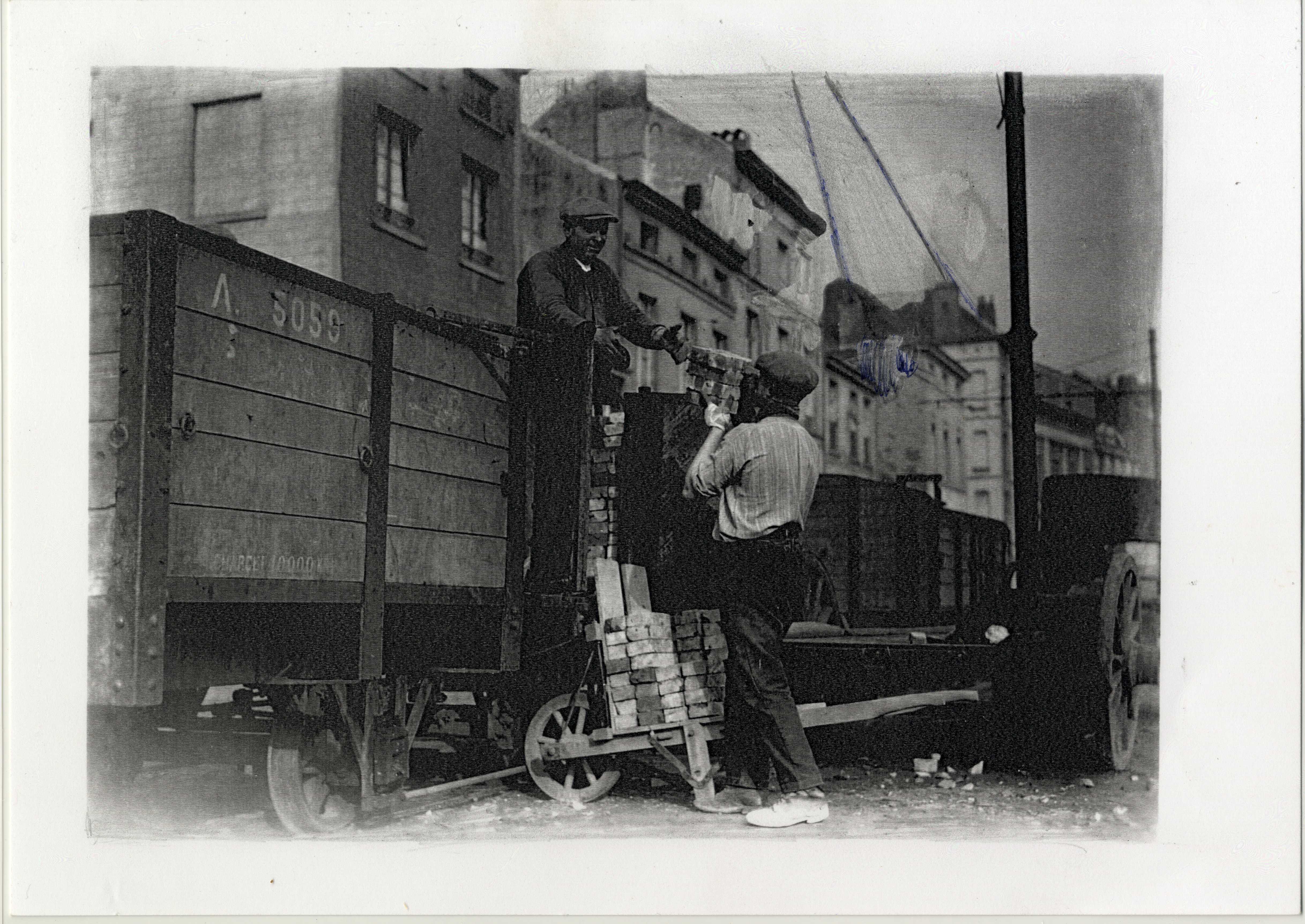 Photo Chargement de briques au Canal de Charleroi, Quai de Mariemont (Molenbeek-Saint-Jean), photogr. Jacques Hersleven (?), s.d. [annés 1930 ?].