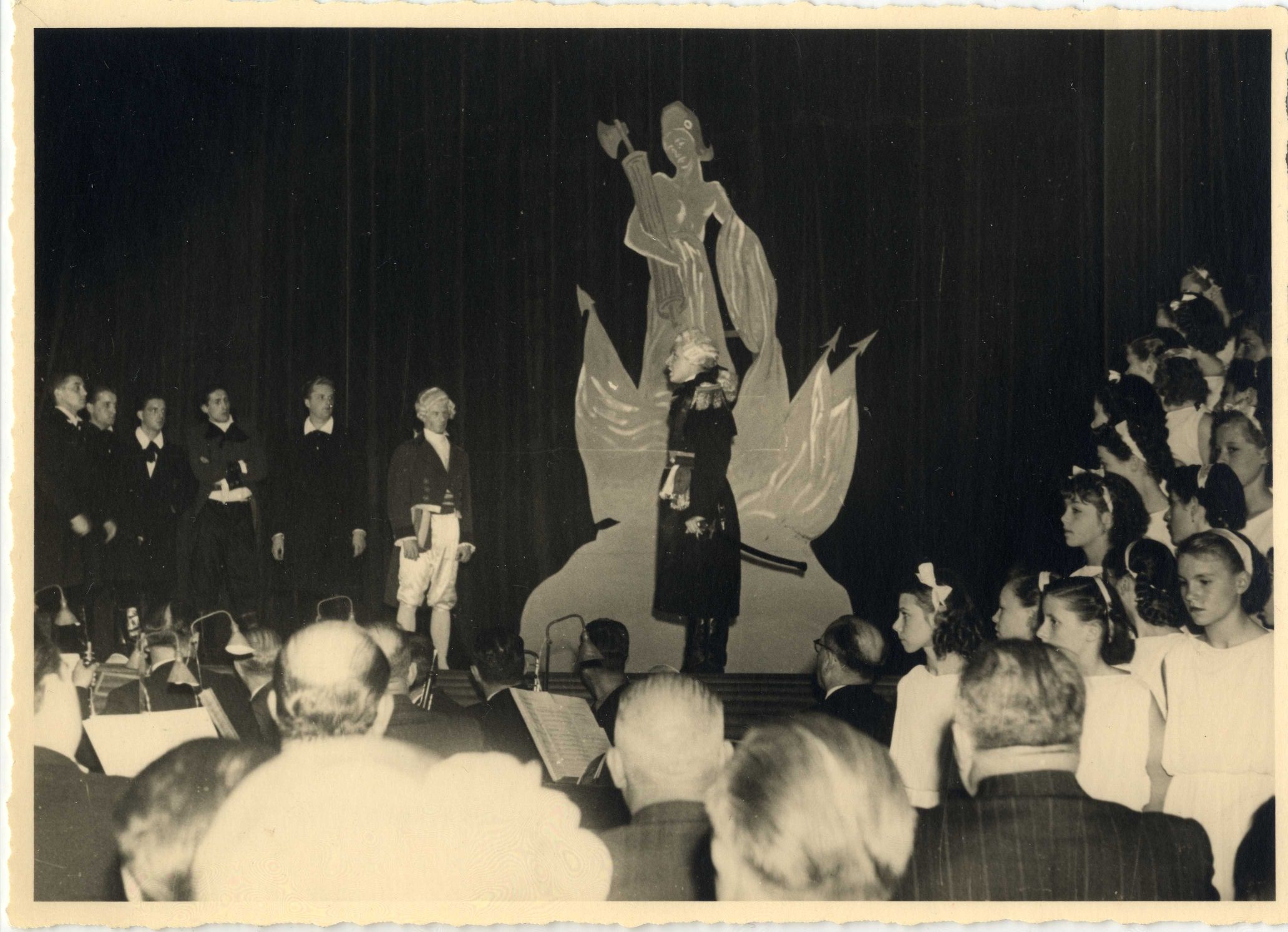 Photo Théâtre scolaire sur la scène du cinéma Crystal (Molenbeek-Saint-Jean), photogr. anon., 1950.