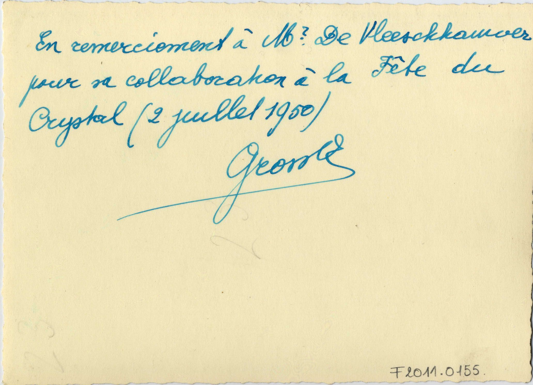 "En remerciement à Mr De Vleeschhauwer pour sa collaboration à la Fête du Crystal (2 juillet 1950)