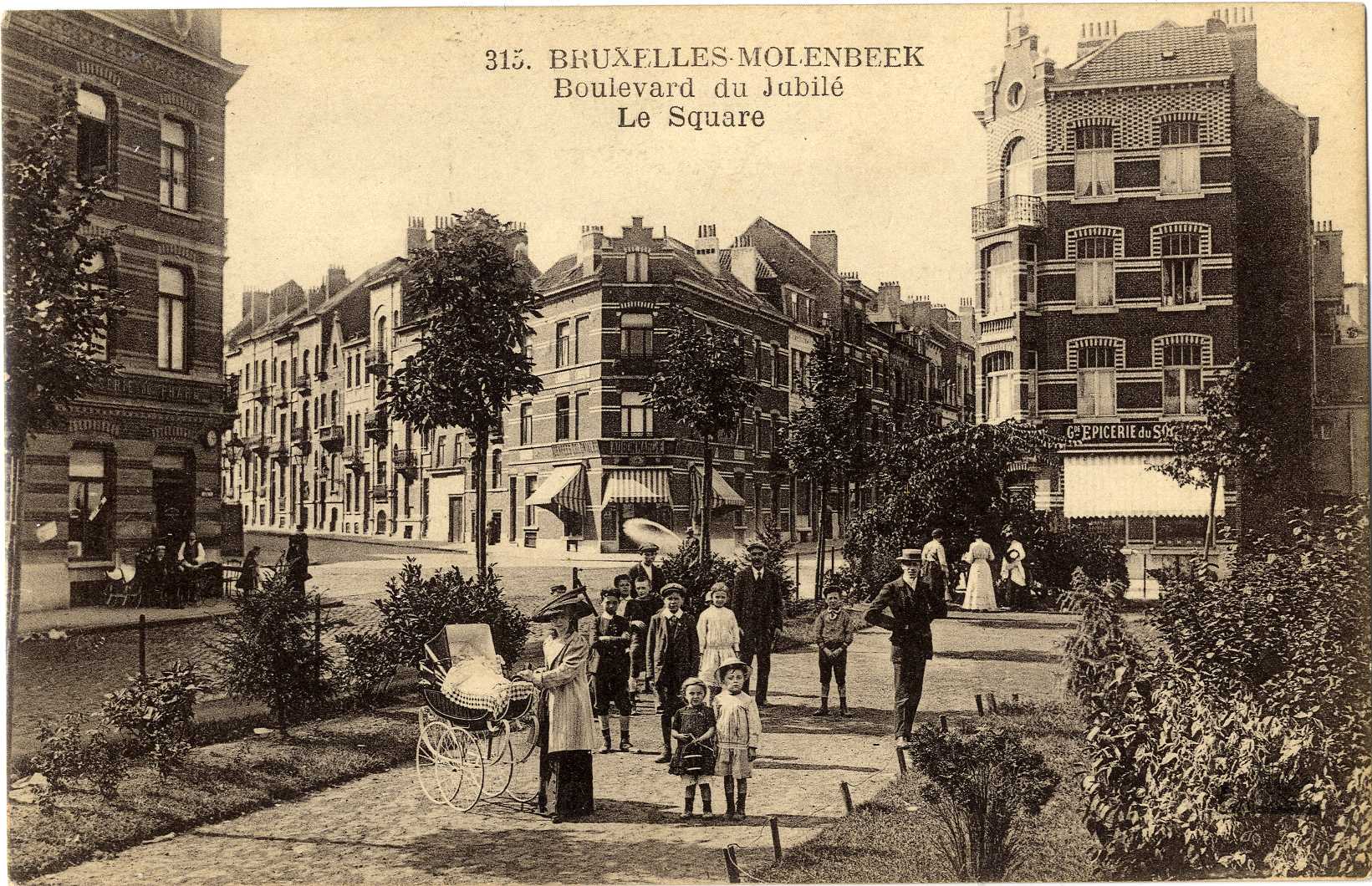 Carte-vue Promeneurs au (futur) Square des Libérateurs (Molenbeek-Saint-Jean), éd. Henri Georges (Bruxelles), s.d. [avant 1925].