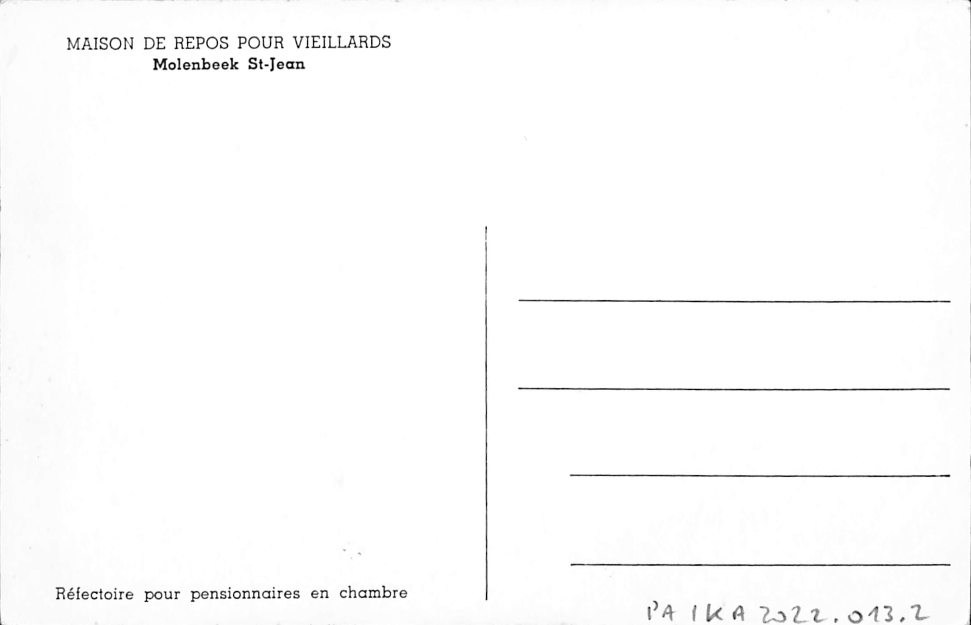Carte-vue Maison de repos pour vieillards de Molenbeek-Saint-Jean [Home Arcadia]. Réfectoire pour pensionnaires en chambre, s.éd., s.d. [vers 1950].