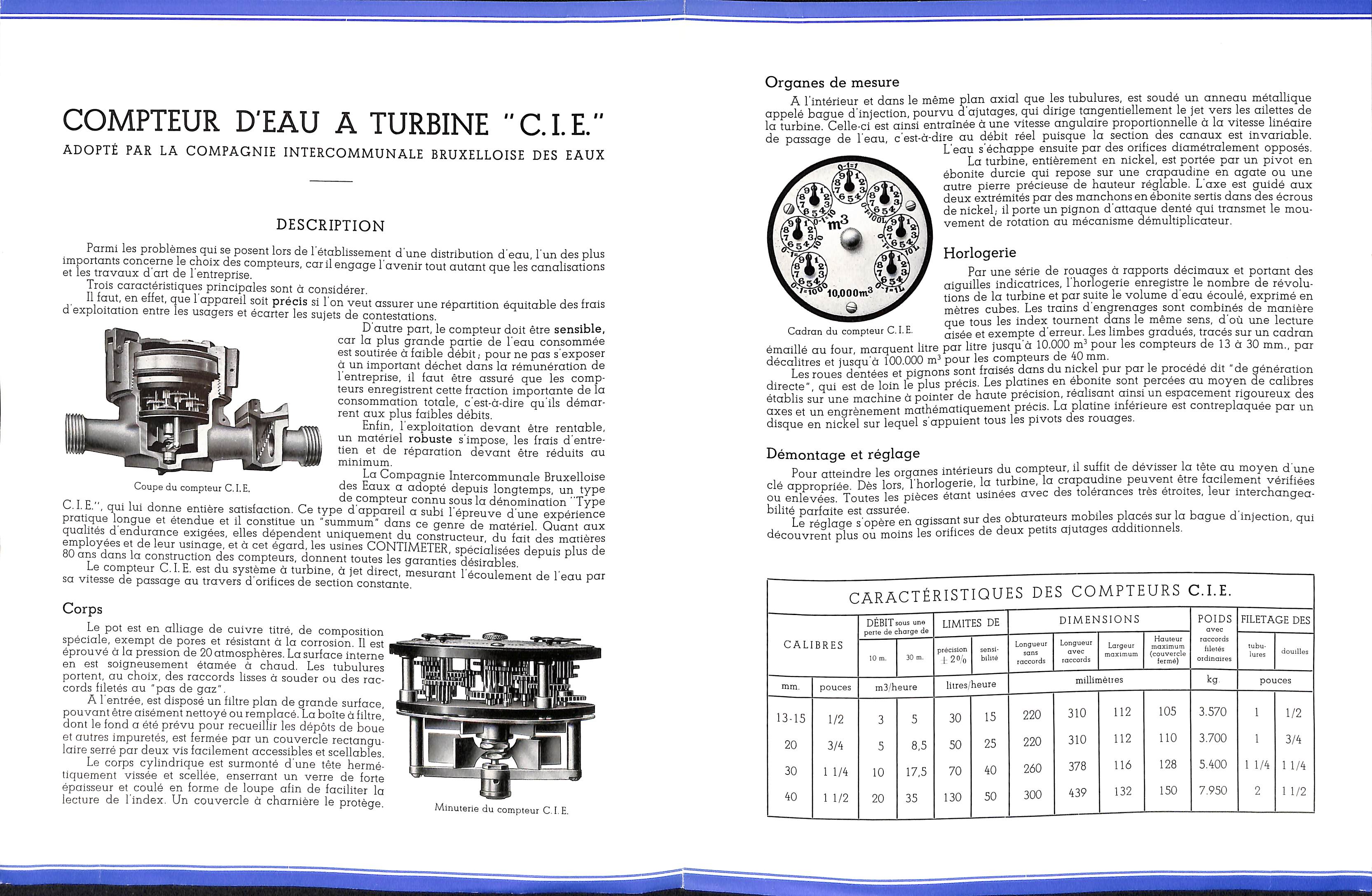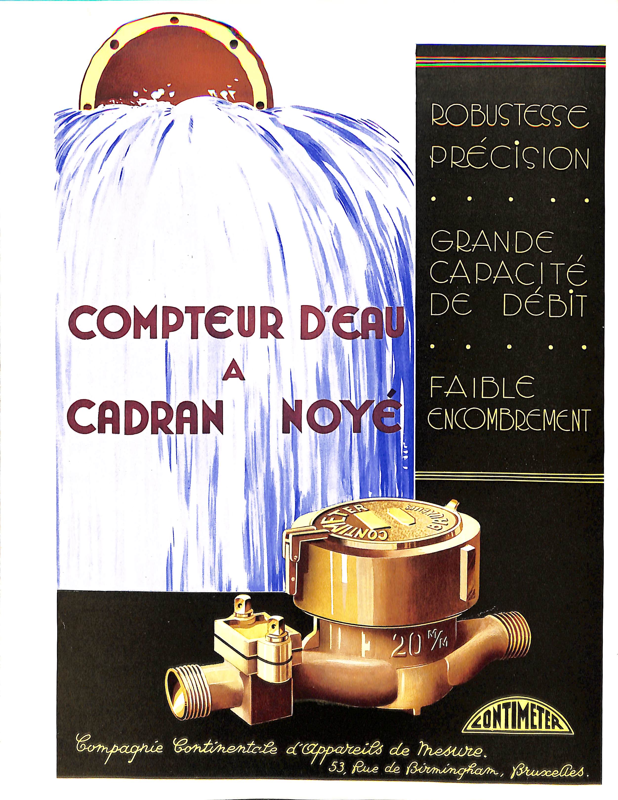 Folder publicitaire Contimeter, Compagnie continentale d'appareils de mesure, compteur d'eau à cadran noyé, Rue de Birmingham, 53 (Molenbeek-Saint-Jean), s.d.