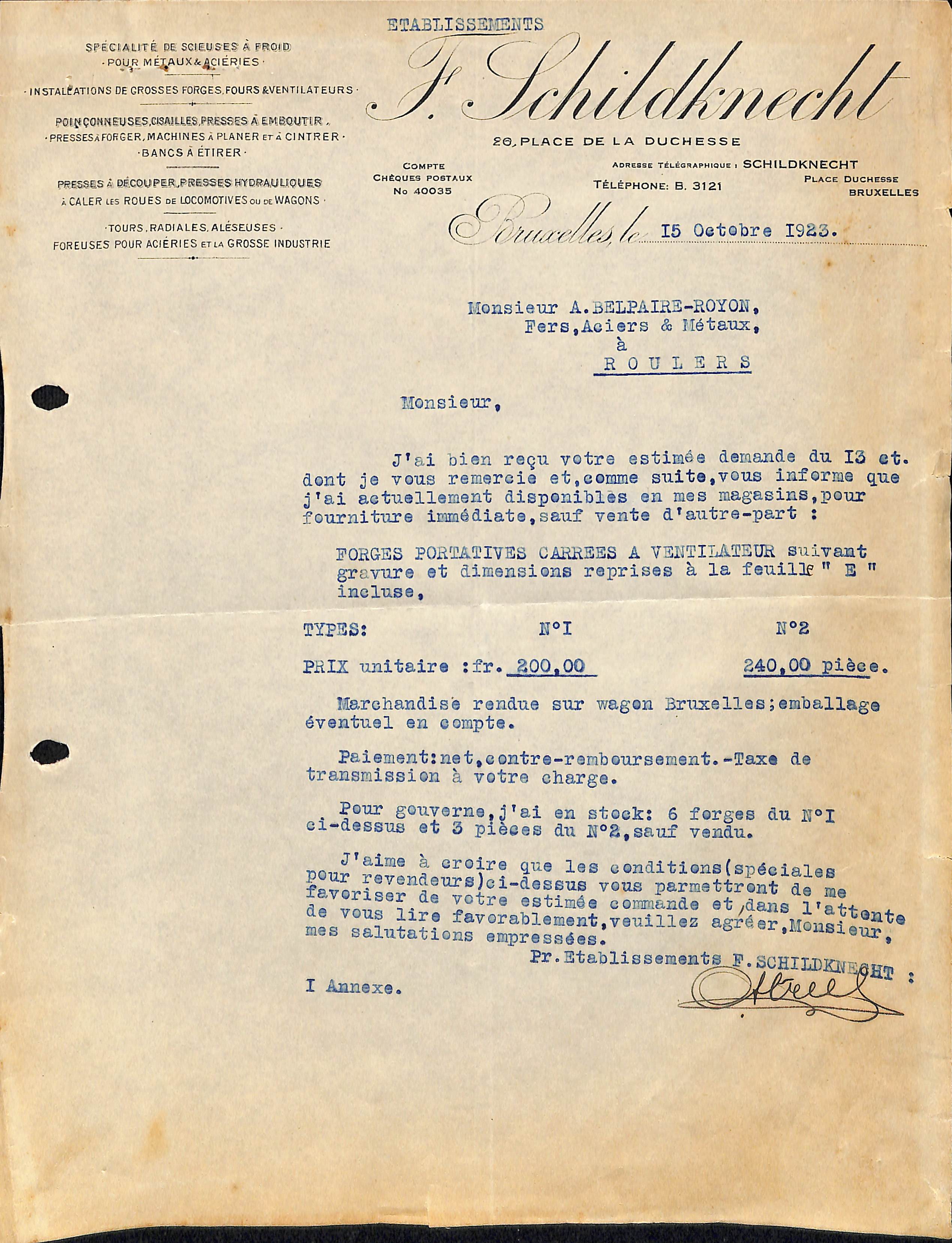 Courrier commercial et feuillet publicitaire Etablissements F. Schildknecht, Place de la Duchesse [de Brabant], 26 (Molenbeek-Saint-Jean), 1923.