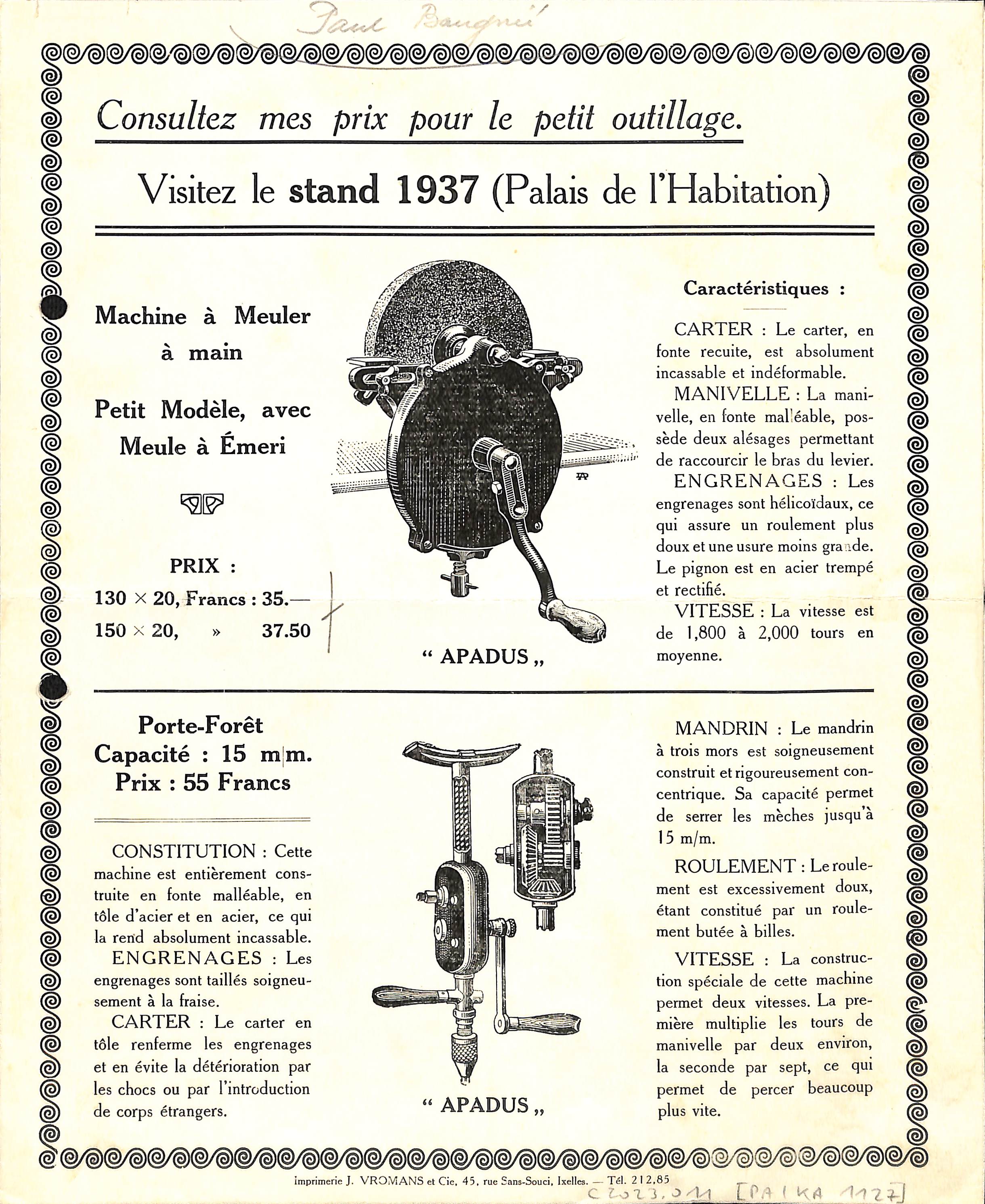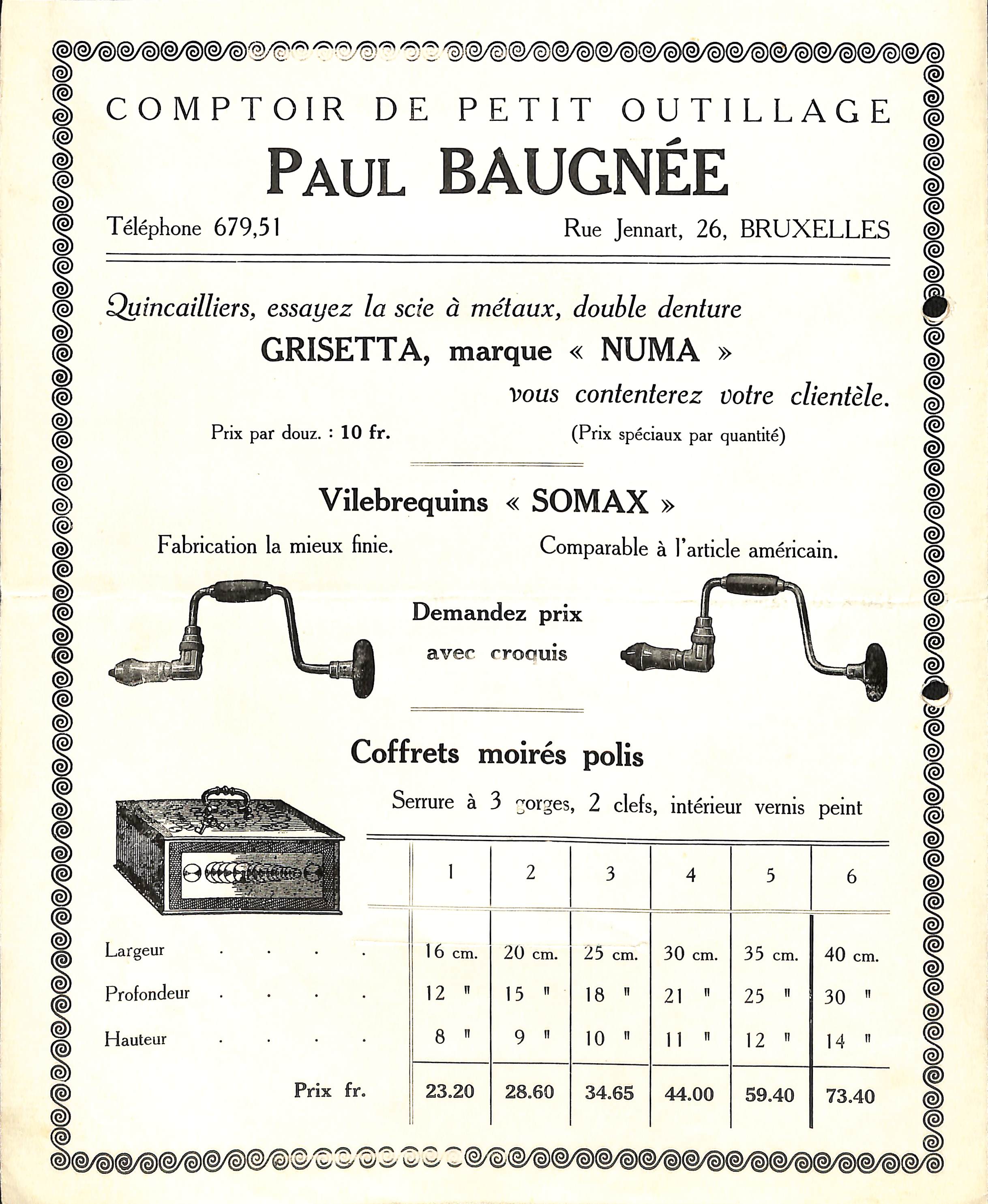 Feuillet publicitaire Comptoir de petit outillage Paul Baugnée, Rue Jennart, 26 (Molenbeek-Saint-Jean), 1937.